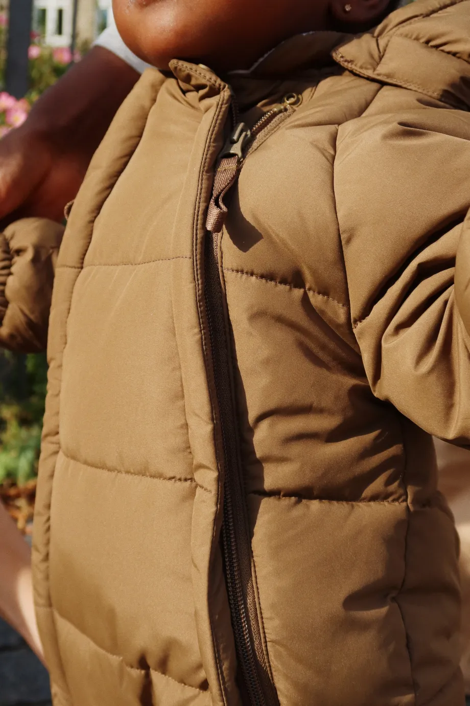Varm flyverdragt med aftagelig hætte og fleecefor ved kroppen og kraven. Praktiske lynlåse foran. der kan lynes helt op. så det er nemt at klæde barnet på. Lavet af: Hovedmateriale