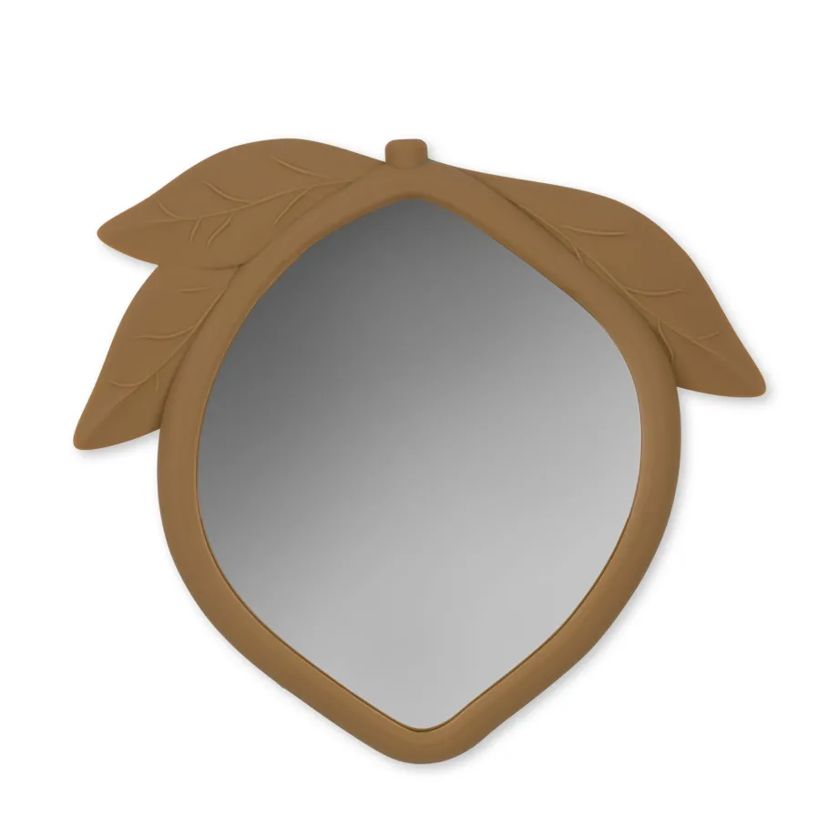 Citronformet spejl med en silikoneramme. der kan bruges i bilen. Spejlet har et justerbart spænde. der kan spændes sikkert fast på bagsædets nakkestøtte. hvilket gør det muligt at