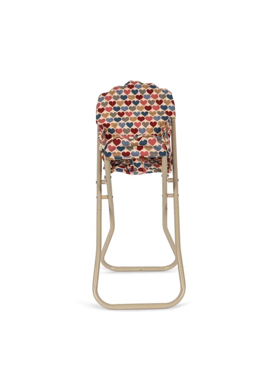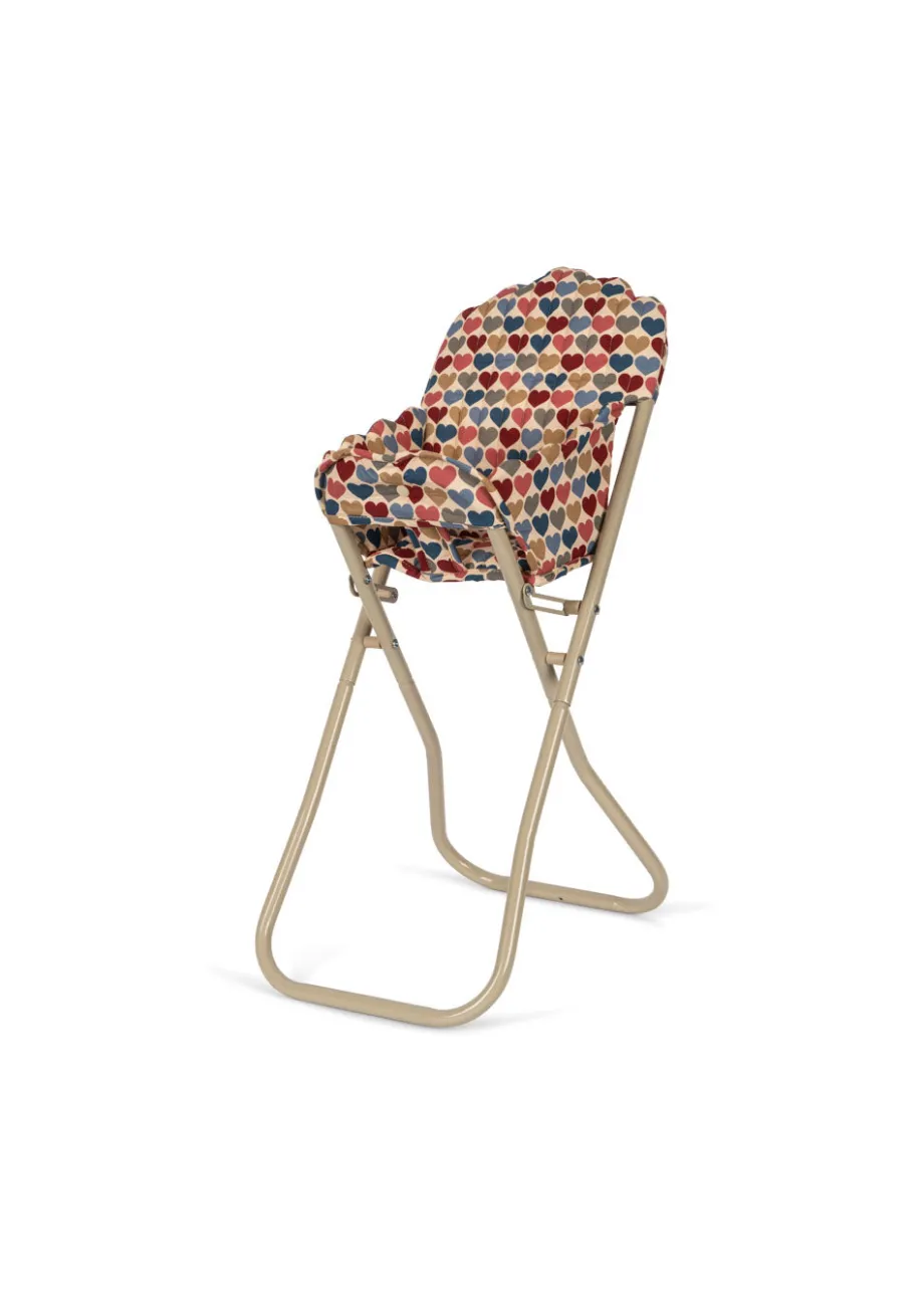 Sammenklappelig højstol til små dukker. så de kan være med ved bordet. Med aftageligt sæde. Designet med muslingekant. H: 63 cm x B: 41 cm x D: 27 cm. Fra 3 år. Materiale: Hovedmat