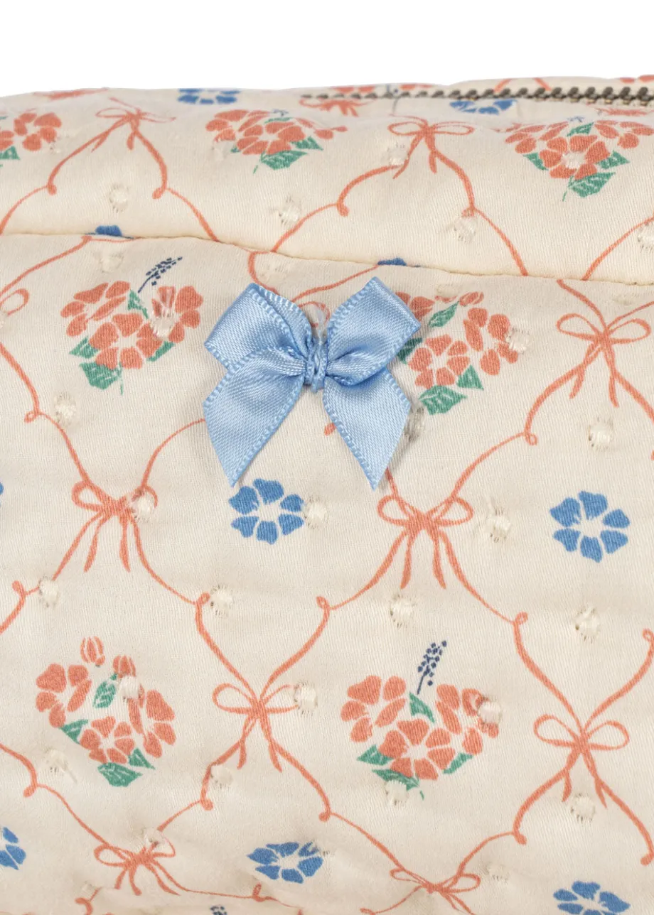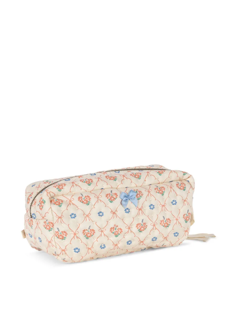 Quiltet toilettaske i 100 % økologisk bomuld. Forsynet med en lille lomme indeni. Mål: L: 25 cm x D: 11.5 cm x H: 11.5 cm Dette produkt er certificeret i henhold til OEKO-TEX® ST