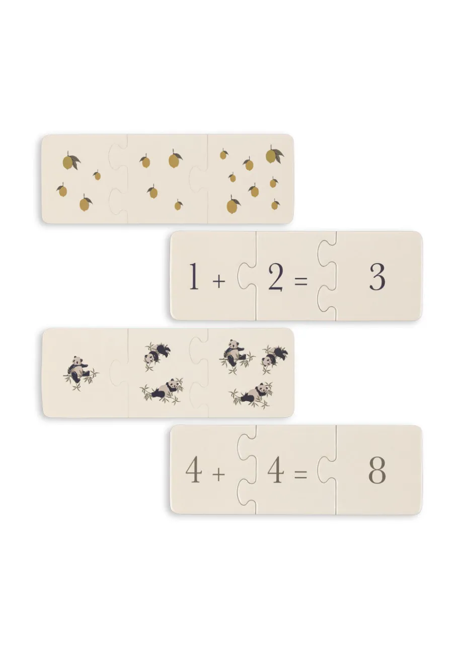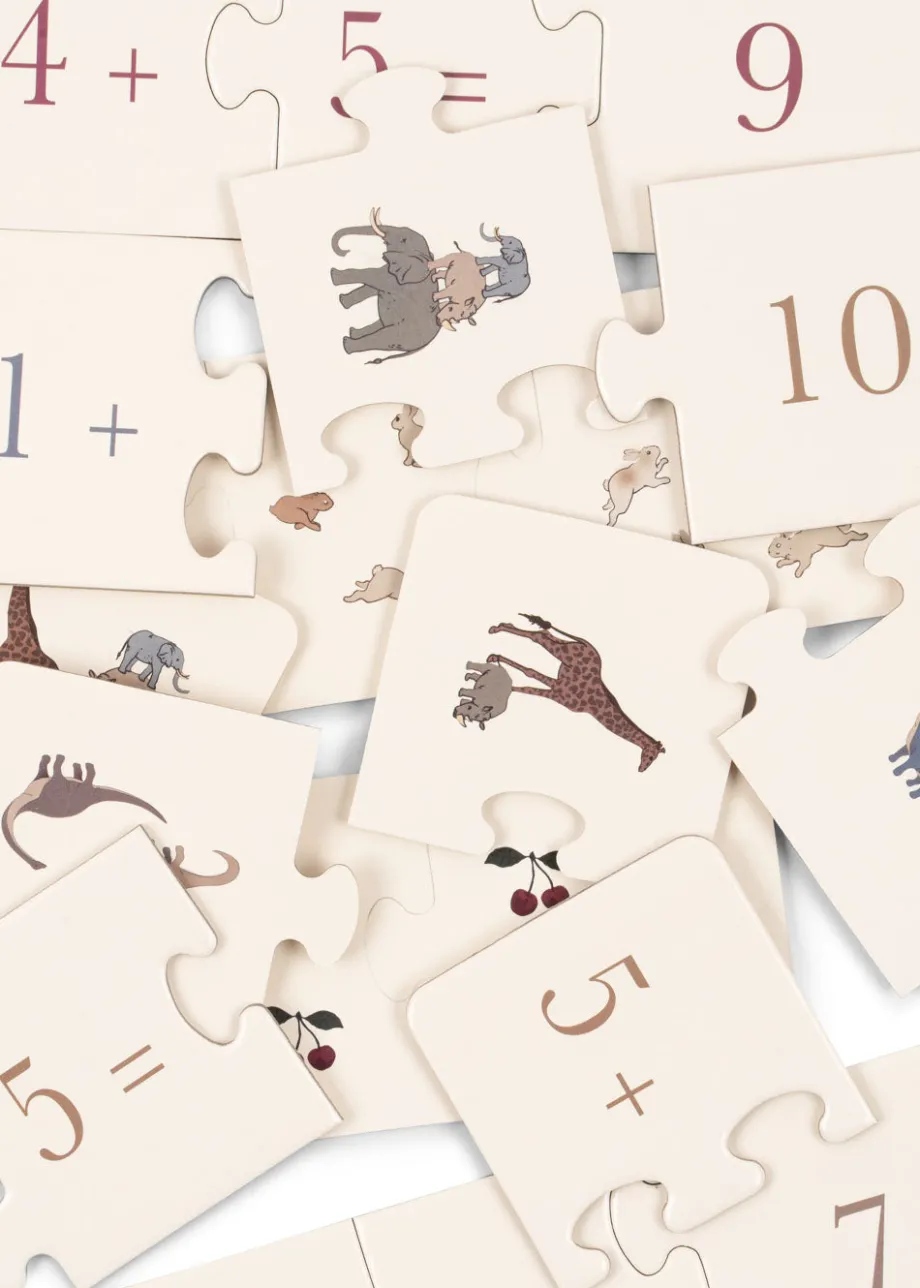 En sjov måde at lære matematik på! Match tallet med det korrekte antal motiver på den modsatte puslespilsbrik. 27 puslespilsbrikker. Pakket i en fin lille opbevaringsæske. Dette pr