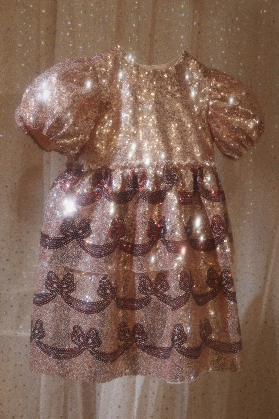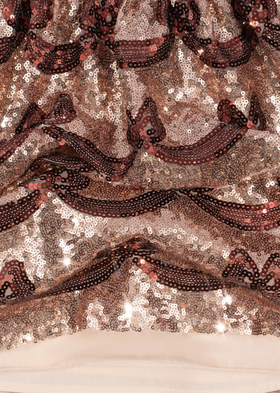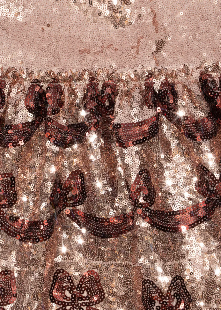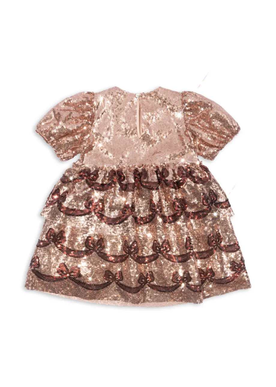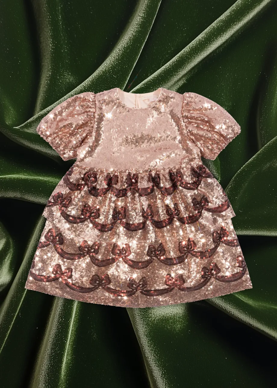 Funklende kjole med korte pufærmer og dekorativt sløjfemønster i pailletter. Lavet af 100 % polyester med for i 100 % bomuld