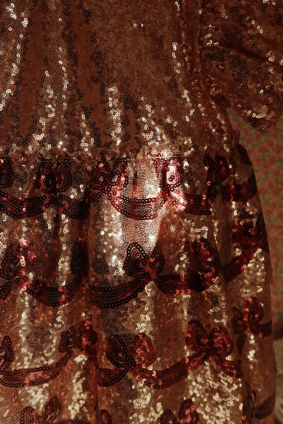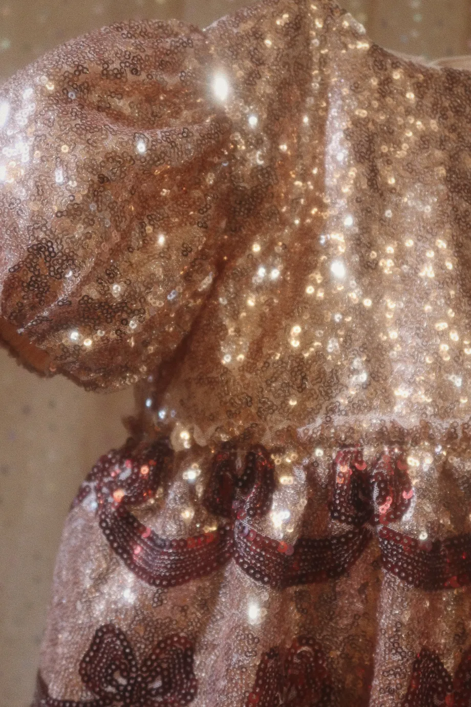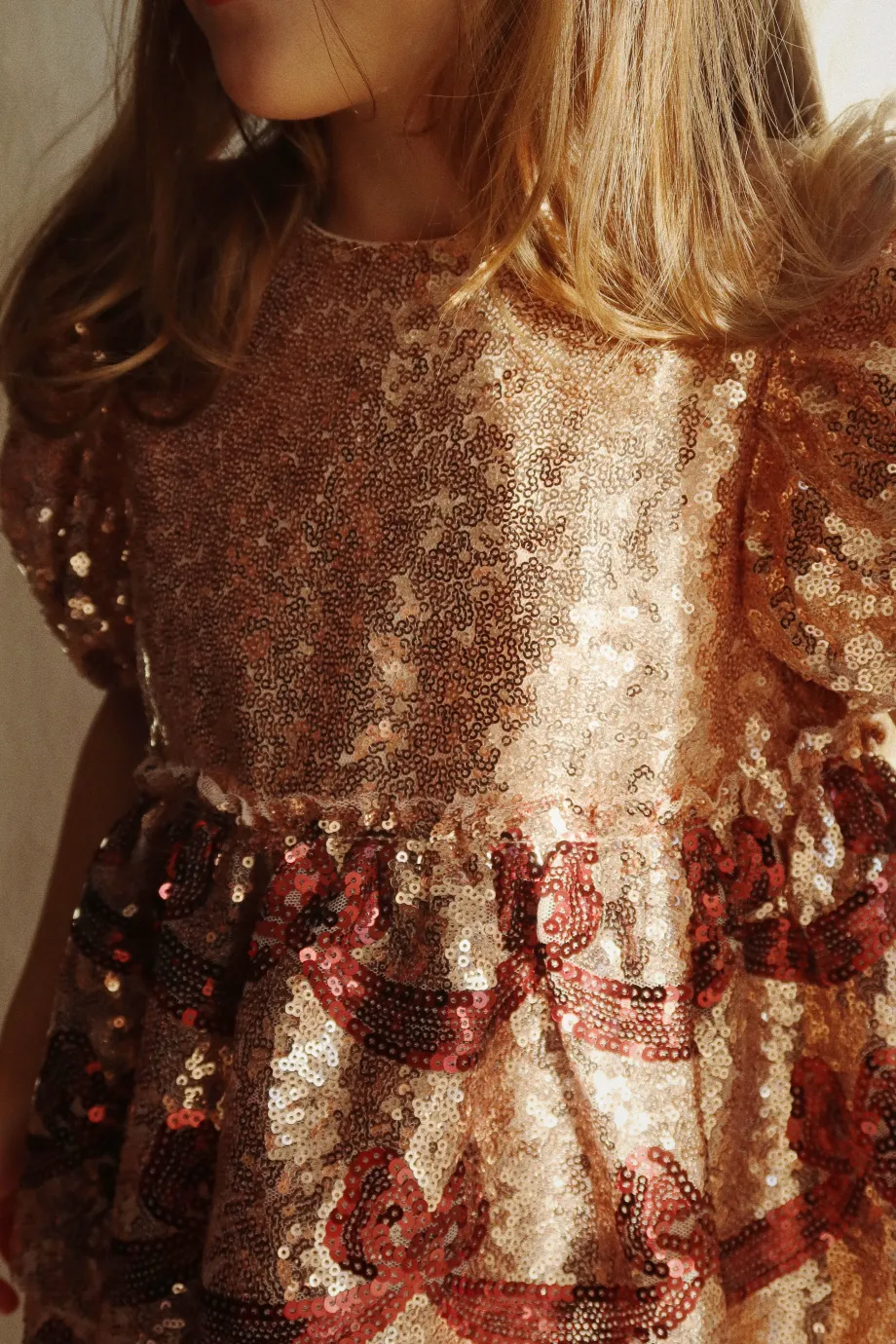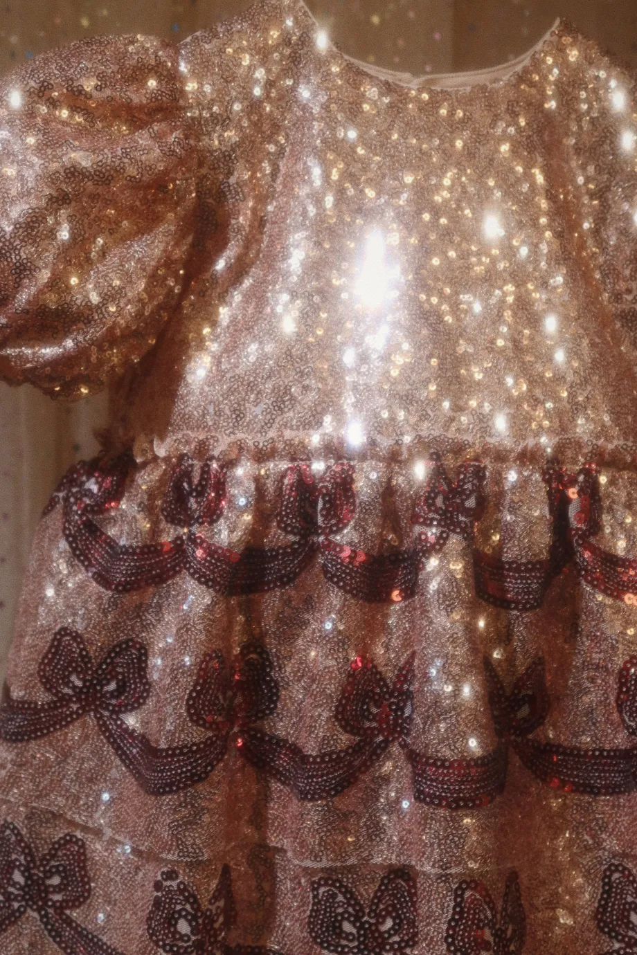 Funklende kjole med korte pufærmer og dekorativt sløjfemønster i pailletter. Lavet af 100 % polyester med for i 100 % bomuld