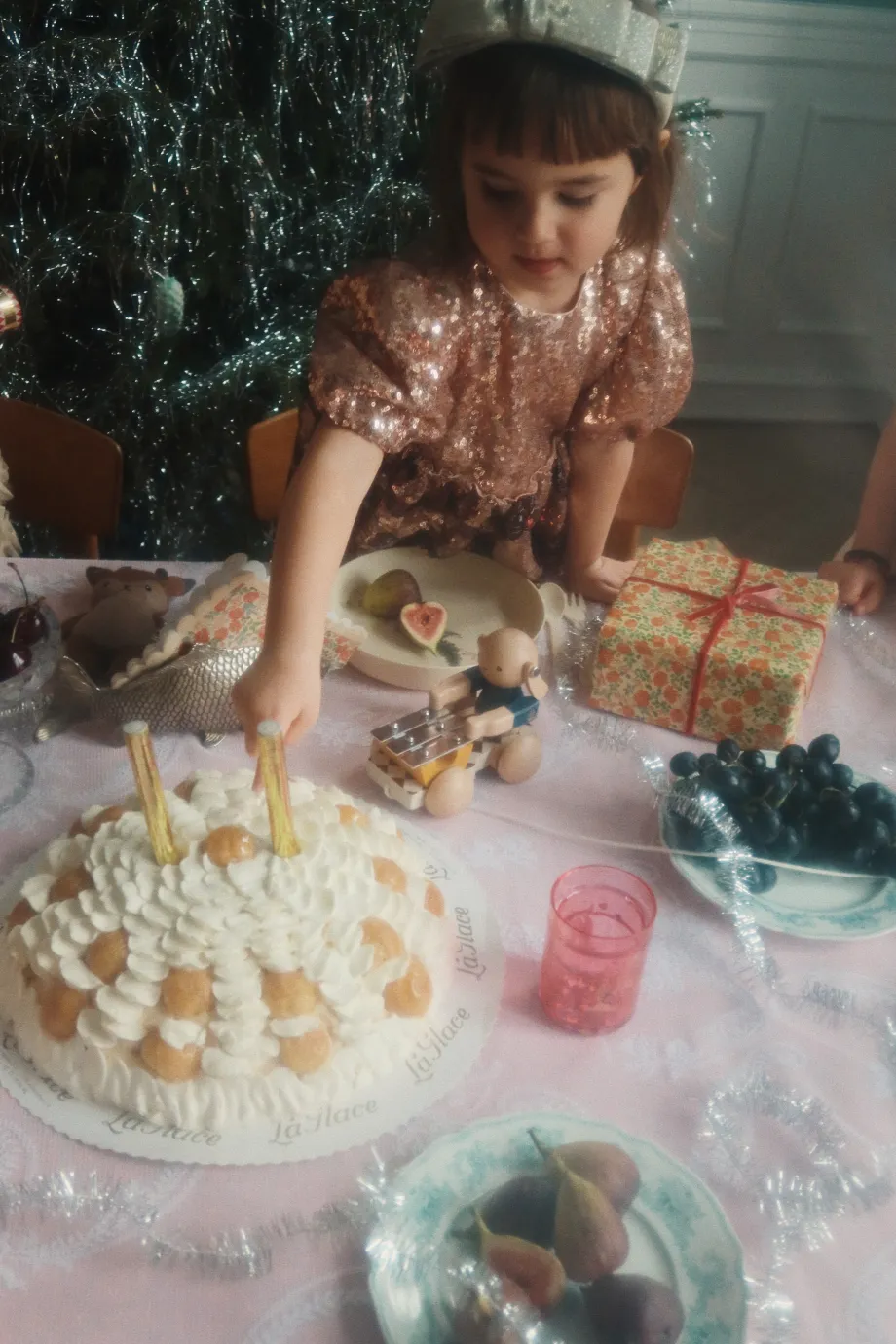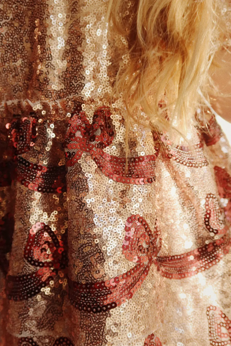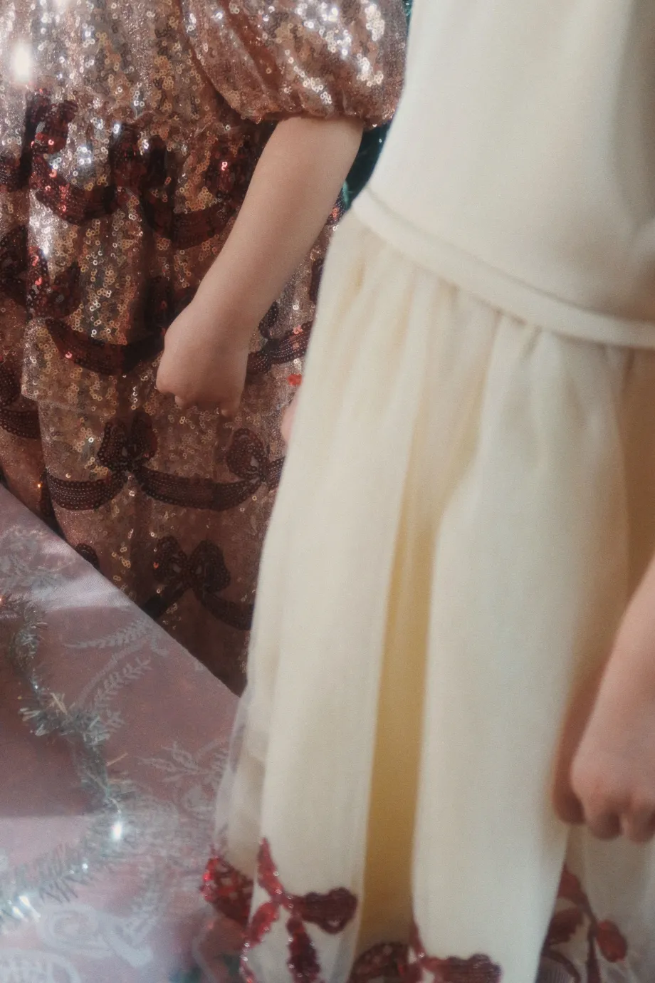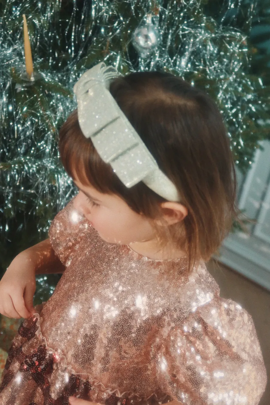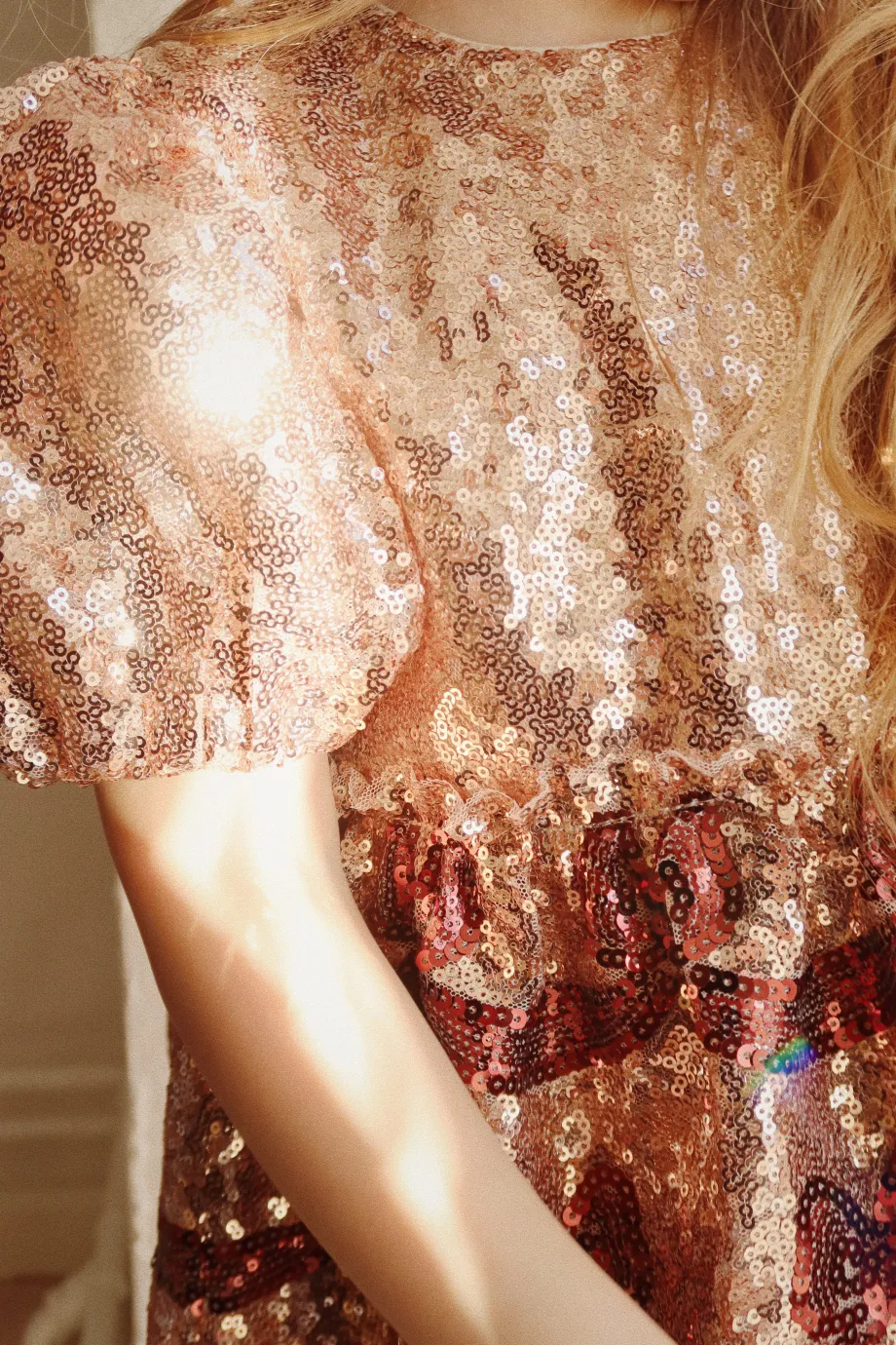 Funklende kjole med korte pufærmer og dekorativt sløjfemønster i pailletter. Lavet af 100 % polyester med for i 100 % bomuld