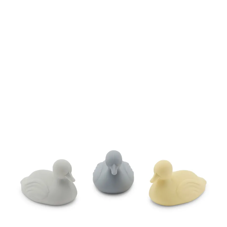 3-pak badeænder til leg i badet. fremstillet i 100% silikone. Kan rengøres med en fugtig klud. Anvend ikke kemikalier på badeænderne.