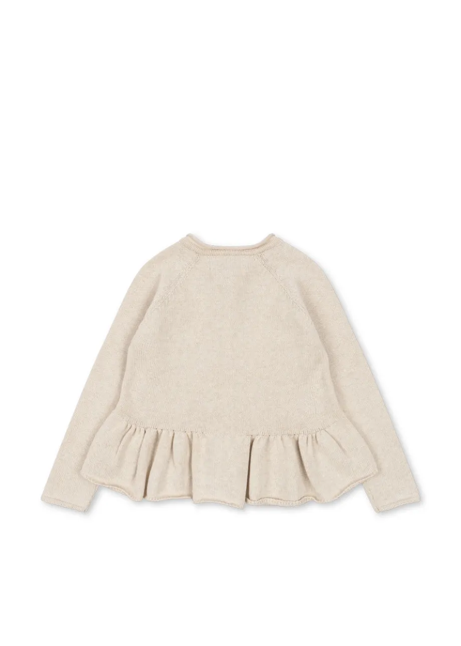 Blød cardigan med rullekant ved halsen og flæsedetaljer. Designet i et dekorativt strikket mønster med perlemorsknapper foran. Off-white melange: lavet af 100 % økologisk bomuld. P