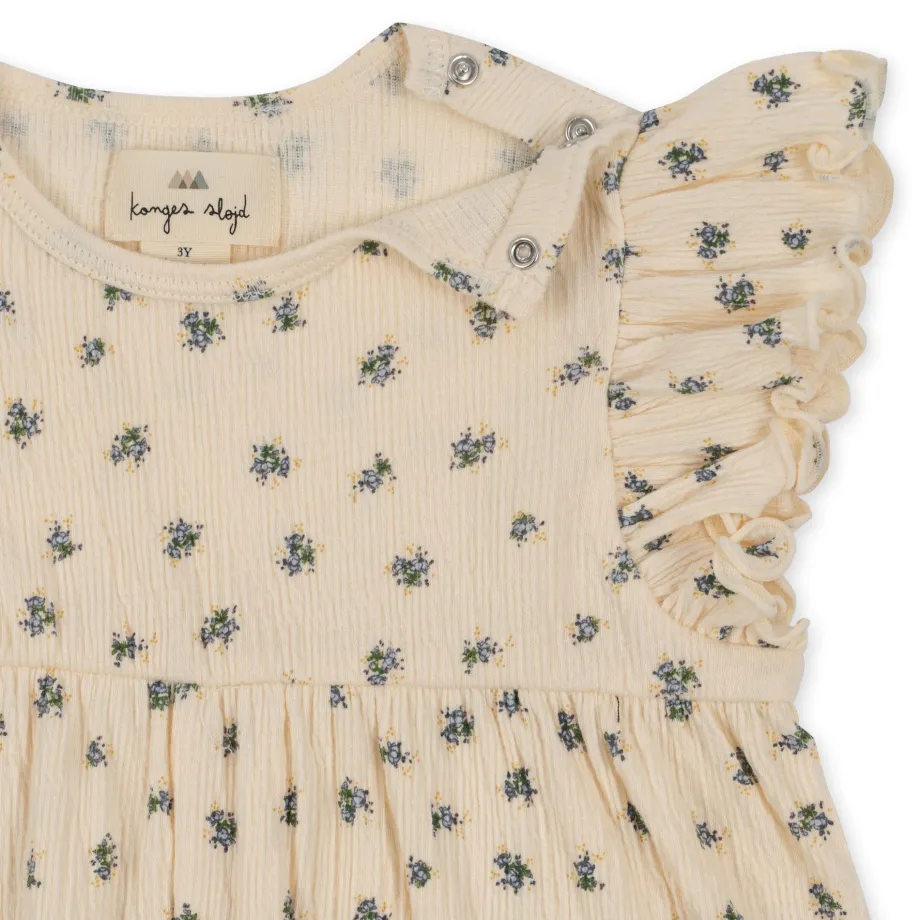 Heldragt med brede ben og flæser. Designet med trykknapper ved benåbningen. som gør det nemt at klæde barnet på. Fremstillet af 97% økologisk bomuld og 3% elastan GOTS. Organic.