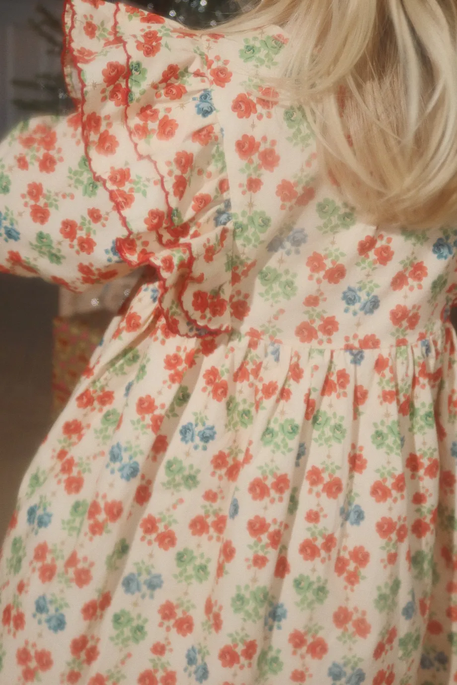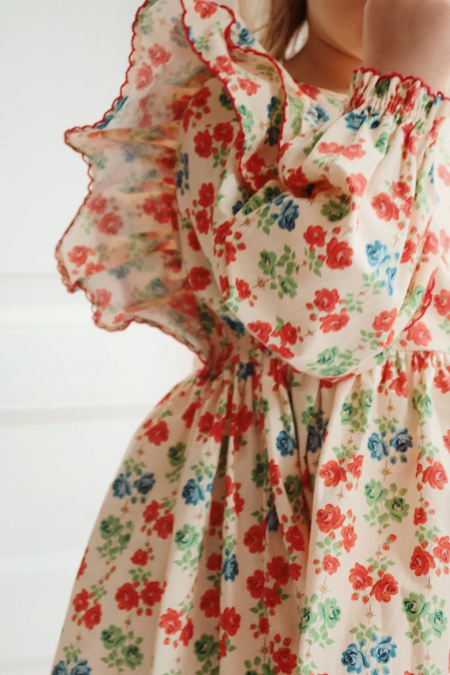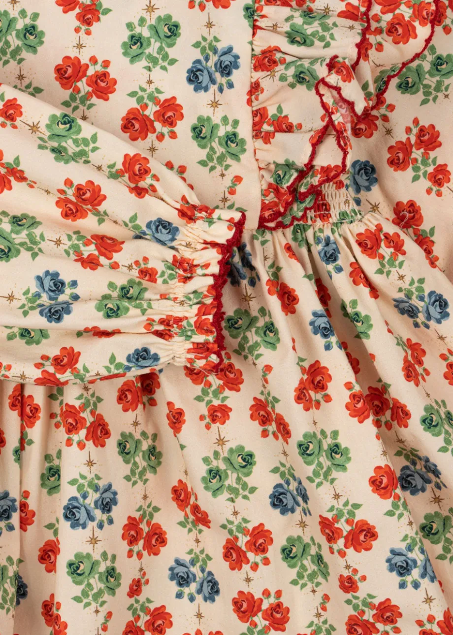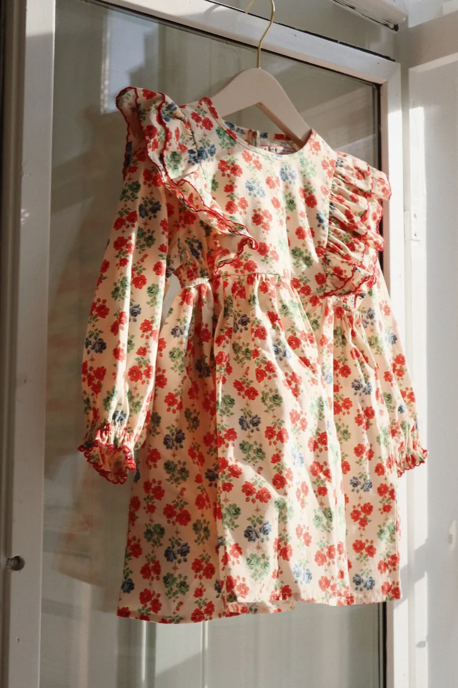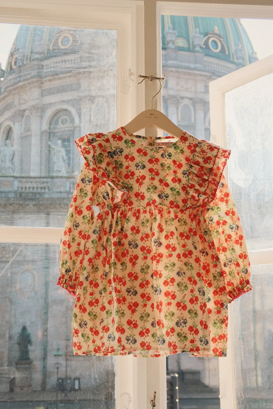 Vævet bomuldskjole med flæsedetaljer ved skuldrene og skørt med vidde. Fremstillet af 100% økologisk bomuld GOTS. økologisk. certificeret af CU1094701