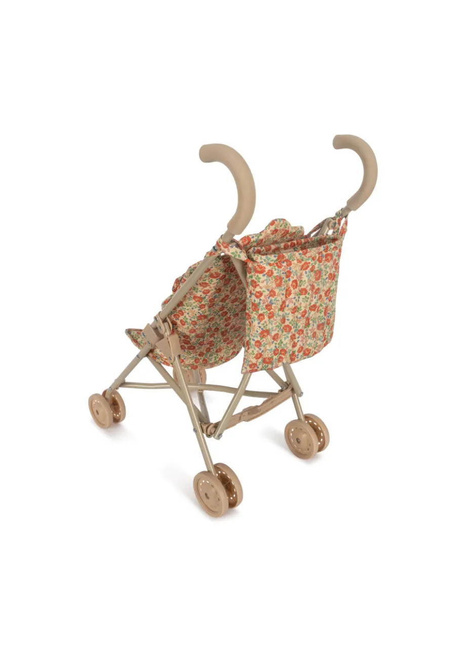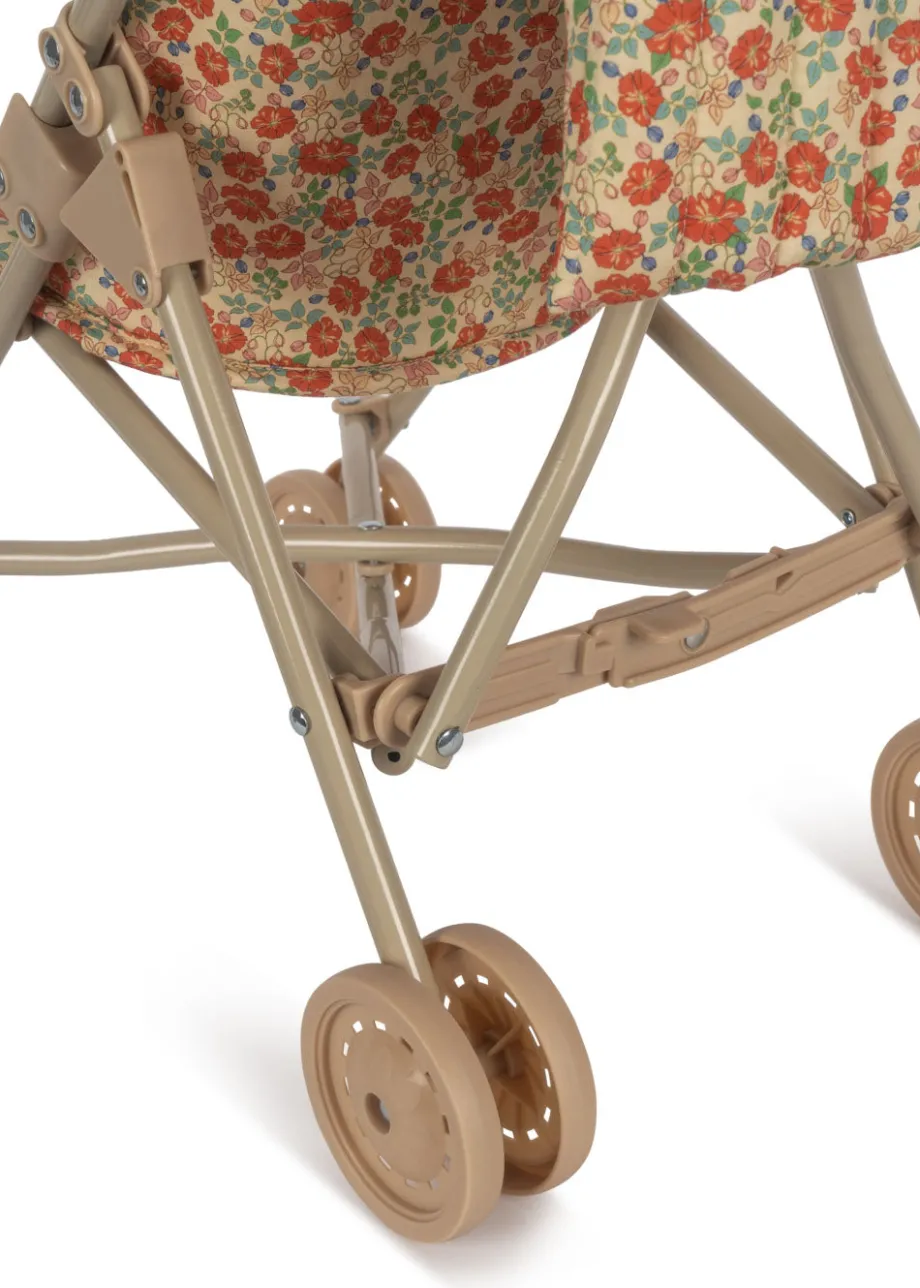 Dukkeklapvogn med sele. bæretaske og dobbelthjul på alle fire ben for ekstra stabilitet. Med aftageligt stof. Leveres fuldt samlet. Let at folde sammen og opbevare. Stellet er frem