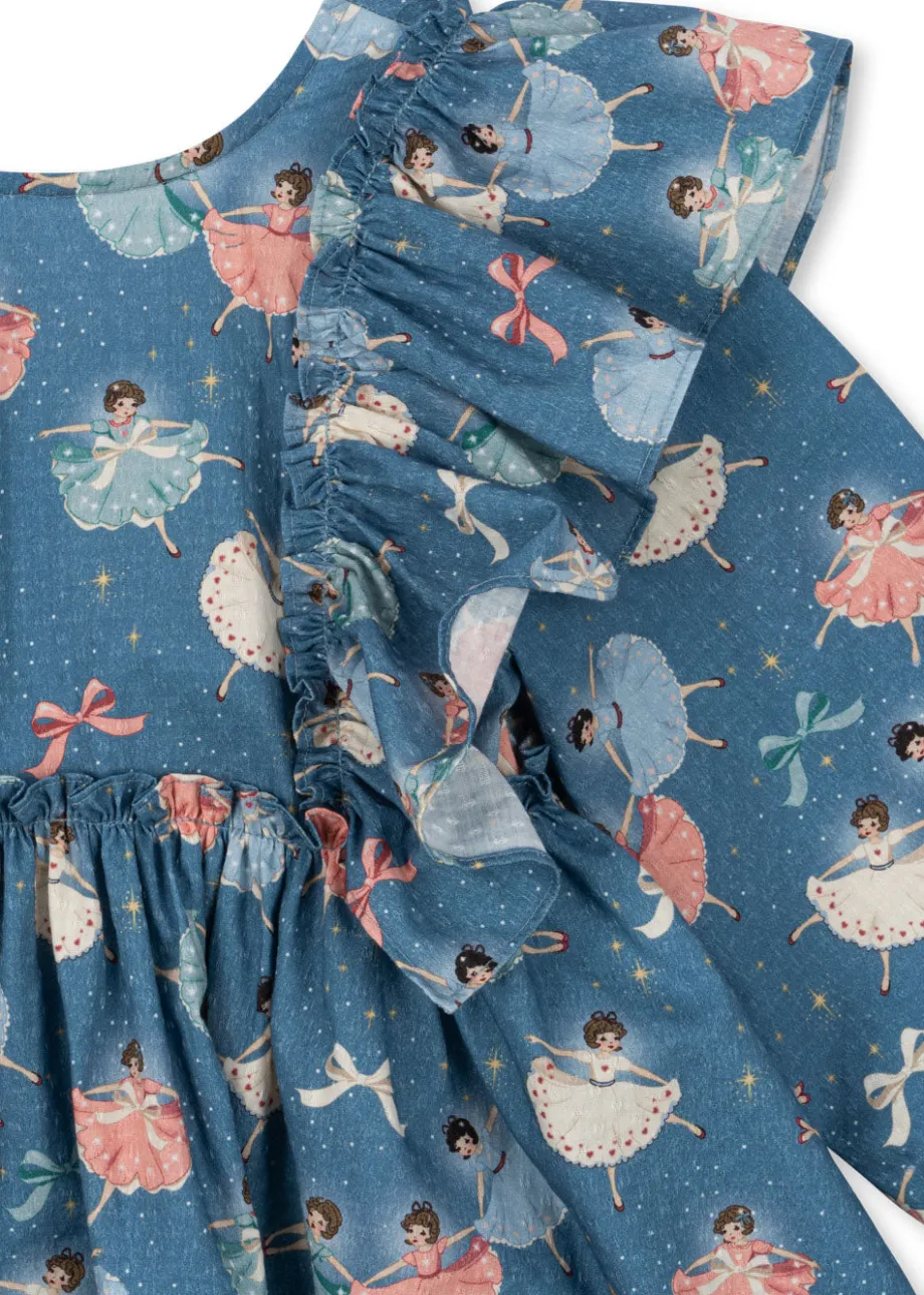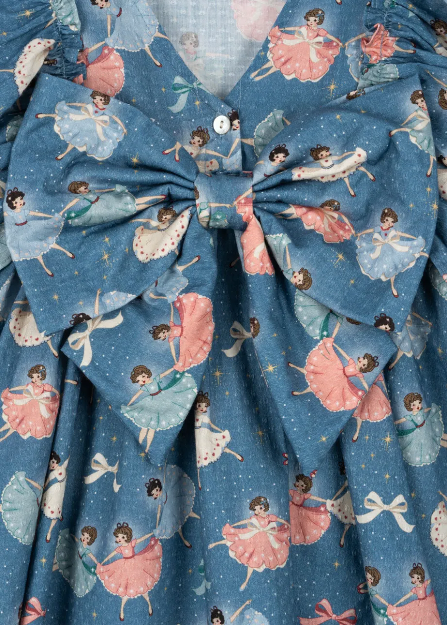 Blød langærmet kjole. Med oversize-sløjfe på ryggen og flæsedetaljer ved ærmerne. Lavet af 100 % økologisk bomuld GOTS. økologisk. certificeret af CU1094701