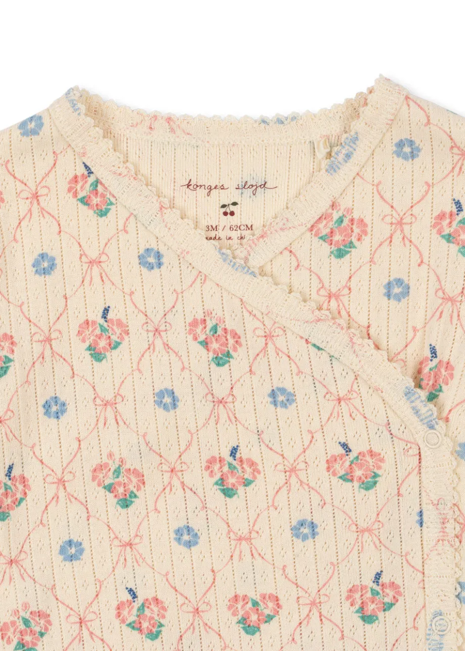 Blød bodystocking med et dekorativt hulmønster og slå-om-lukning. Med trykknapper langs kroppen og i skridtet. der gør det nemt at klæde barnet på. Lavet af 100 % økologisk bomuld.