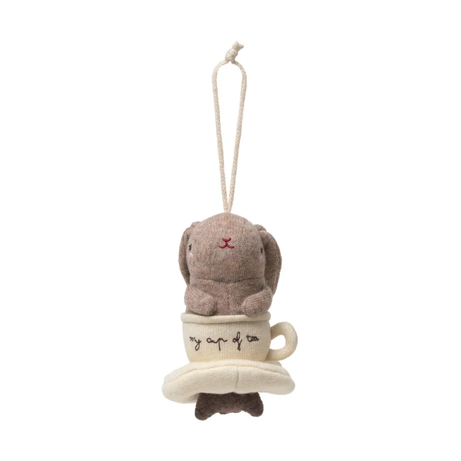 Aktivitets- og musikkanin i 80 % lammeuld og 20 % nylon. der kan spille melodien ”Twinkle. twinkle little star”. Designet med en ophængsstrop i strik og en træring. der er nem for