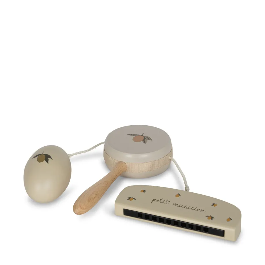 Sæt med musikinstrumenter til små musikere. som leveres i en dekorativ pose med snørelukning. Indeholder: Mundharmonika Ægformet rangle Håndtromme L: 18 x B: 13 x H: 5 cm Dette