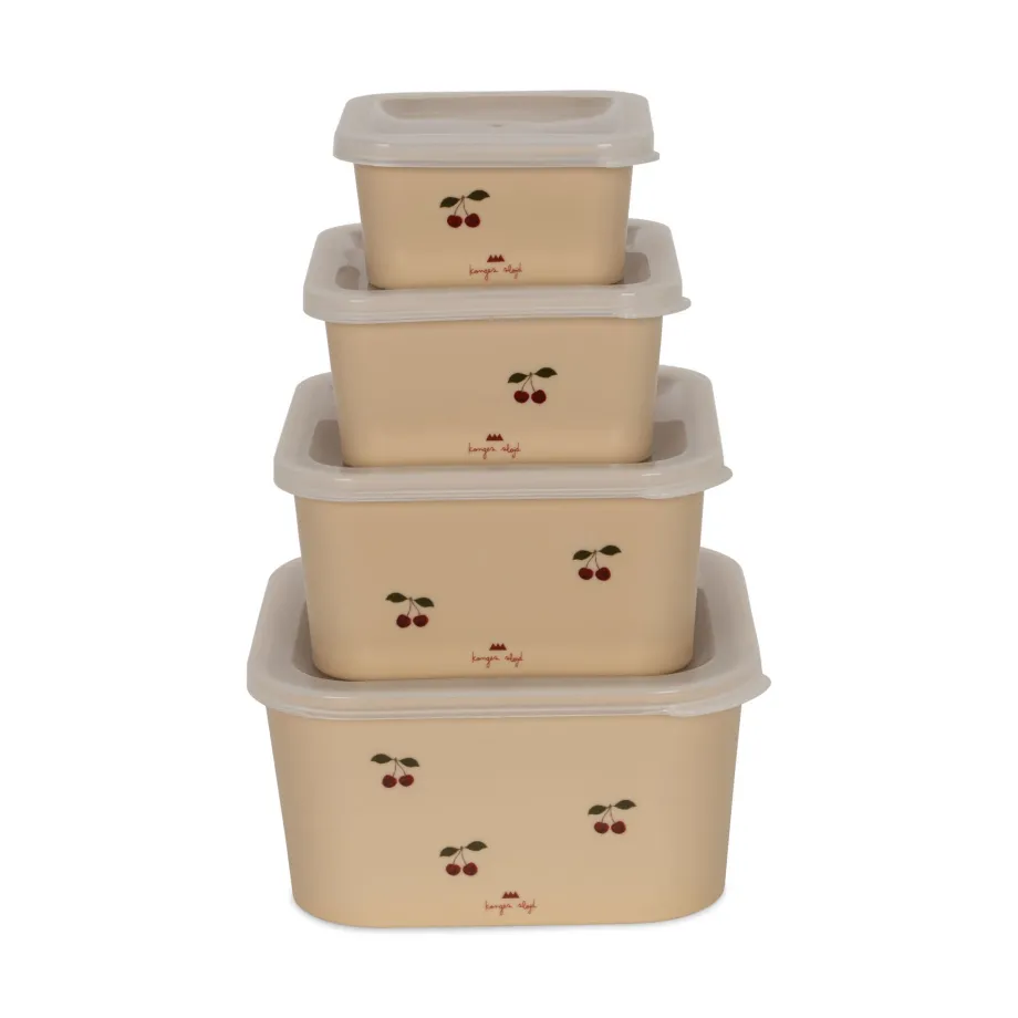 Sæt med kasser til opbevaring af mad og til madpakker. Kasserne er lavet af genanvendt polyethylenterephthalat (rPET) med låg af polyethylen (PE) H: 4.35 cm x B: 8.95 cm x L: 8.9