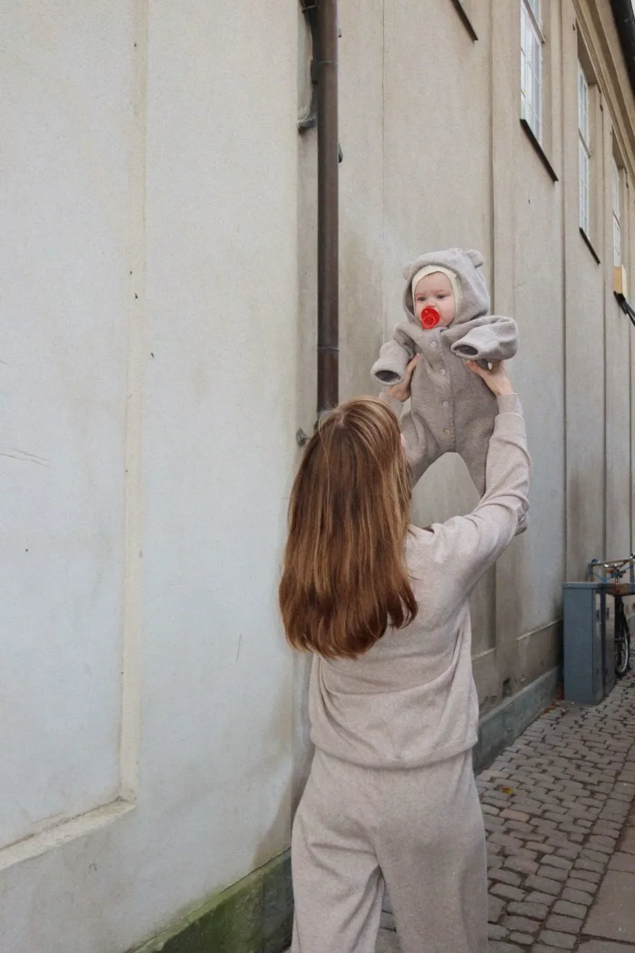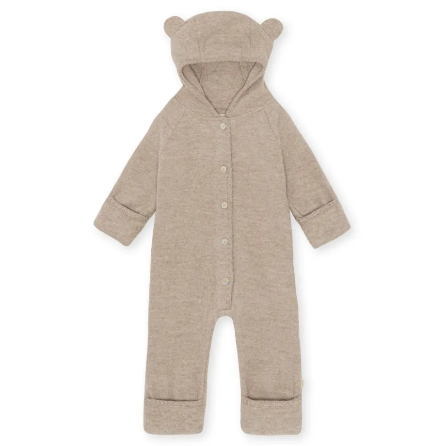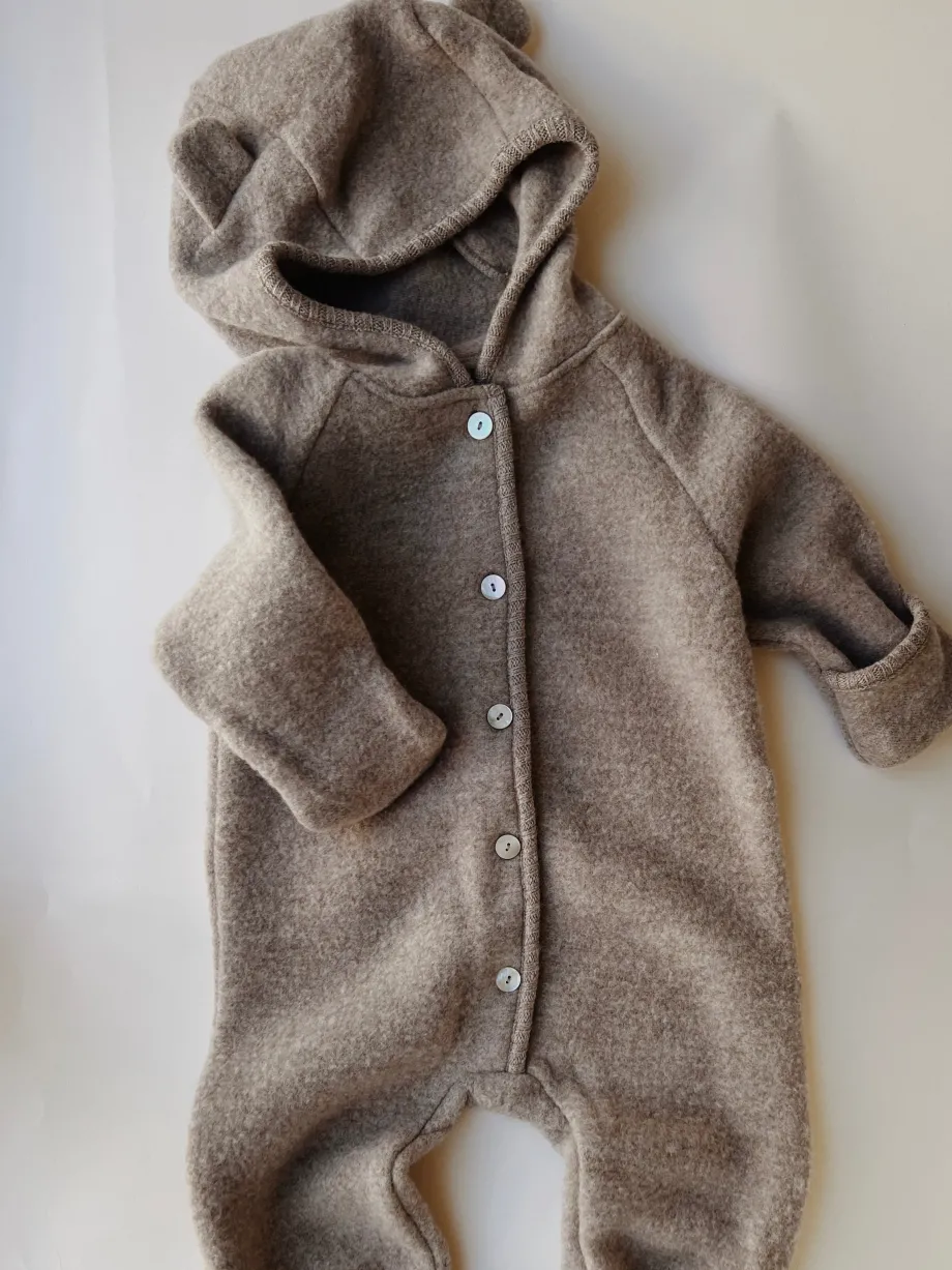 Sparkedragt i 100 procent fleeceuld lavet til at passe de mindste. Kan foldes omkring hænder og fødder. Designet med ribbede detaljer. perlemorsknapper og en hætte med dekorative ø