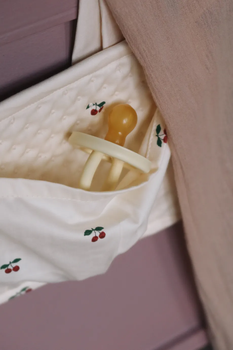 Vores søde og praktiske sengelommer er perfekte til opbevaring af din babys sut. nusseklud og andre fornødenheder ved sengetid. Lavet i vores bedste 100 % økologisk bomuld / satin