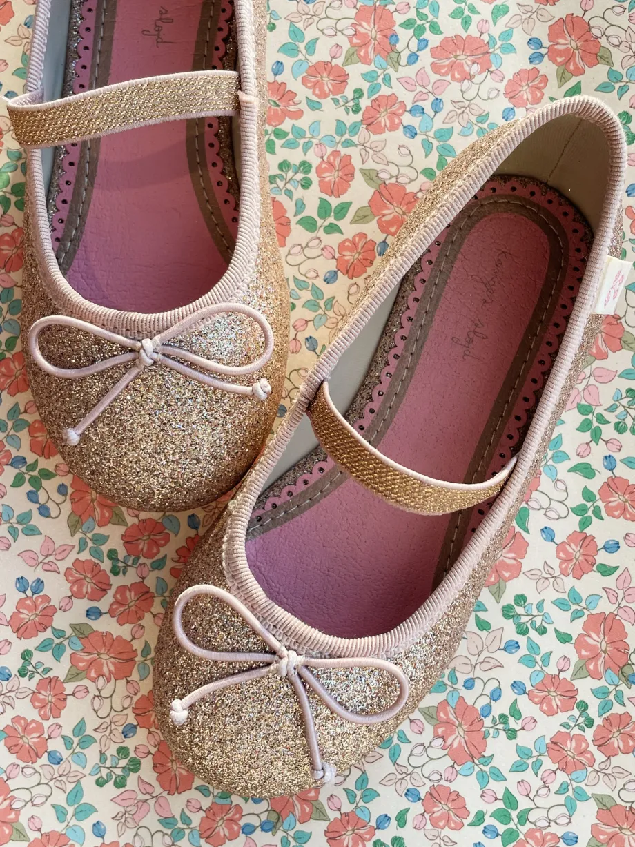 Ballerinasko med glimmer. Materiale: Overdel: 100 % glimmermateriale Tekstil – indersål: PU Ydersål: termoplastisk gummi Indersålens længde i cm: 22: 14.7 cm 23: 15.4 cm 24: 16