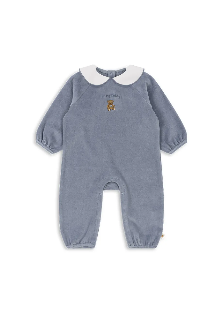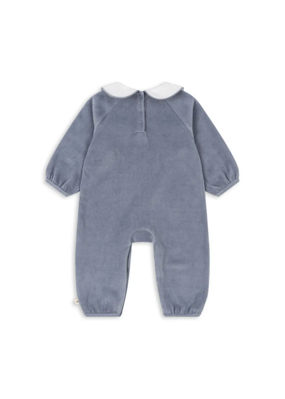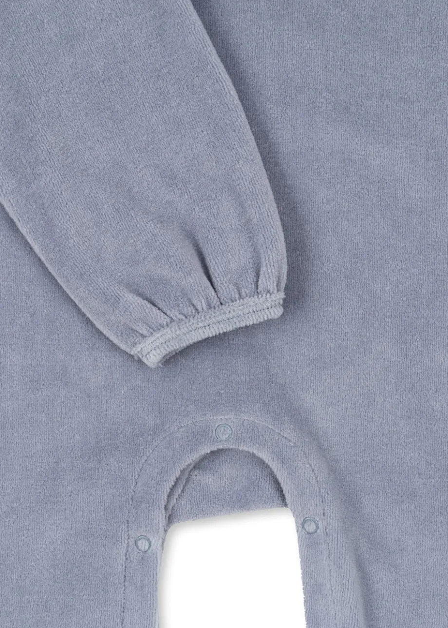 Blød velour-heldragt med en dekorativ krave og broderi på brystet. Lavet af 80 % økologisk bomuld og 20 % genanvendt polyester. GOTS. lavet af 80 % økologiske materialer. certifice