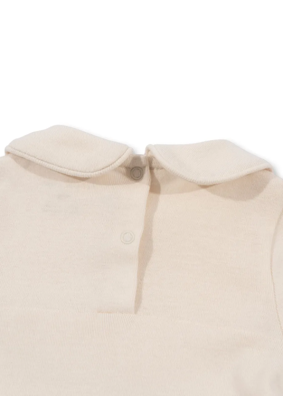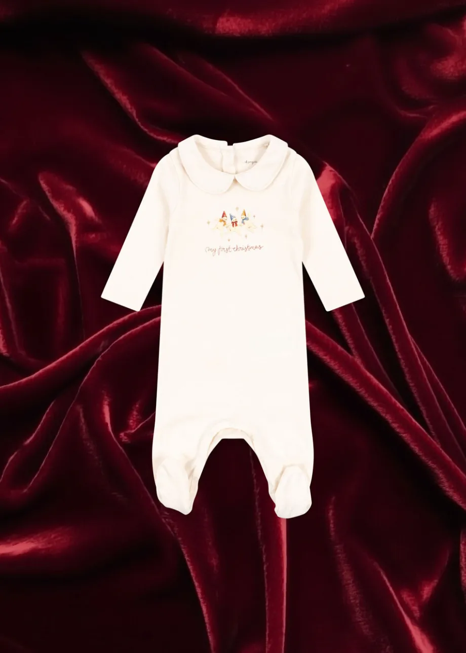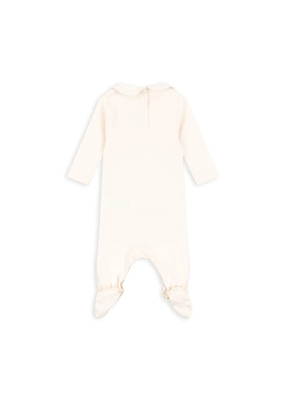 Blød heldragt i bomuld med dekorativ krave og trykknapper langs benene. Lavet af 100 % økologisk bomuld GOTS. økologisk. certificeret af CU1094701