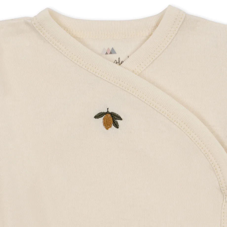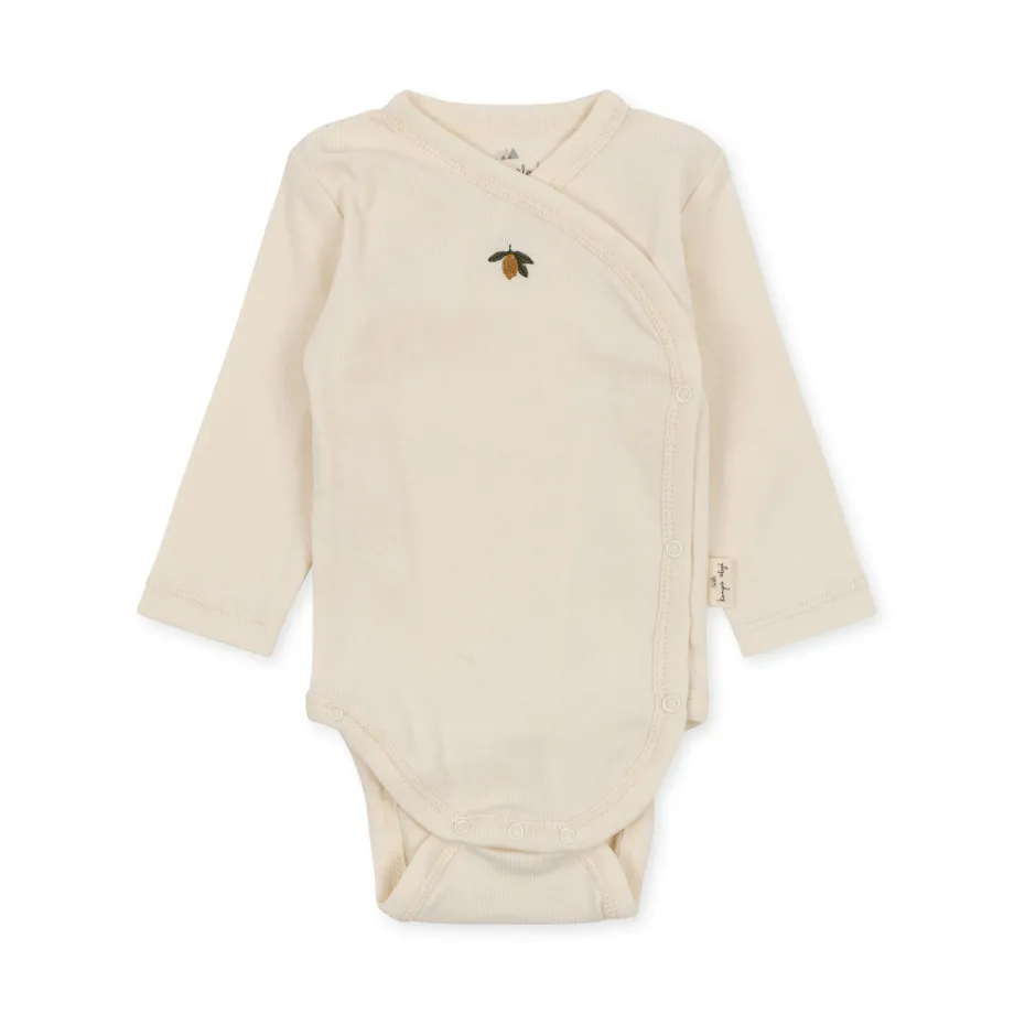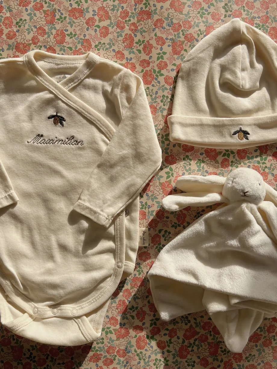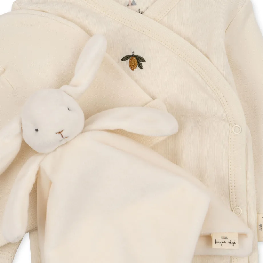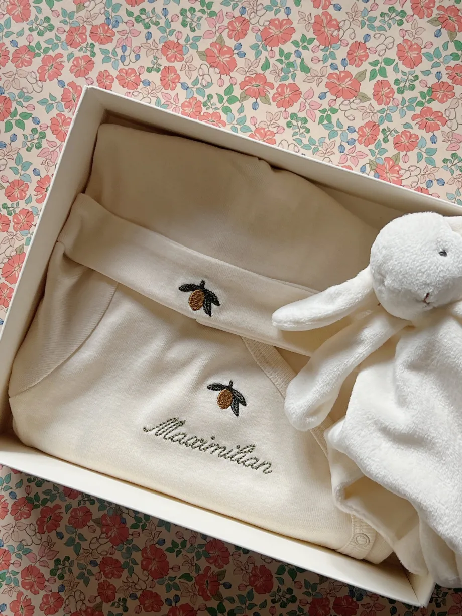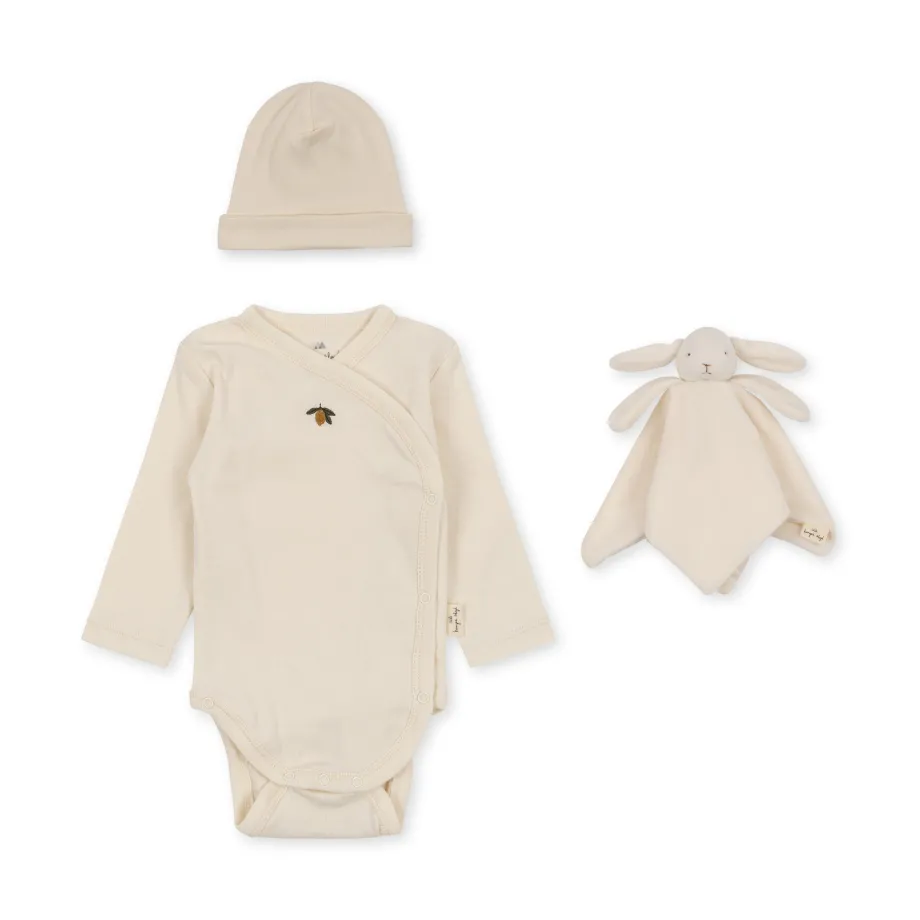 Den perfekte barselsgave med body. hue og nusseklud til en lille ny. Body'en er designet med en lemon foran og praktisk wrap-lukning. Hele sættet er pakket i en dekorativ gaveæske.