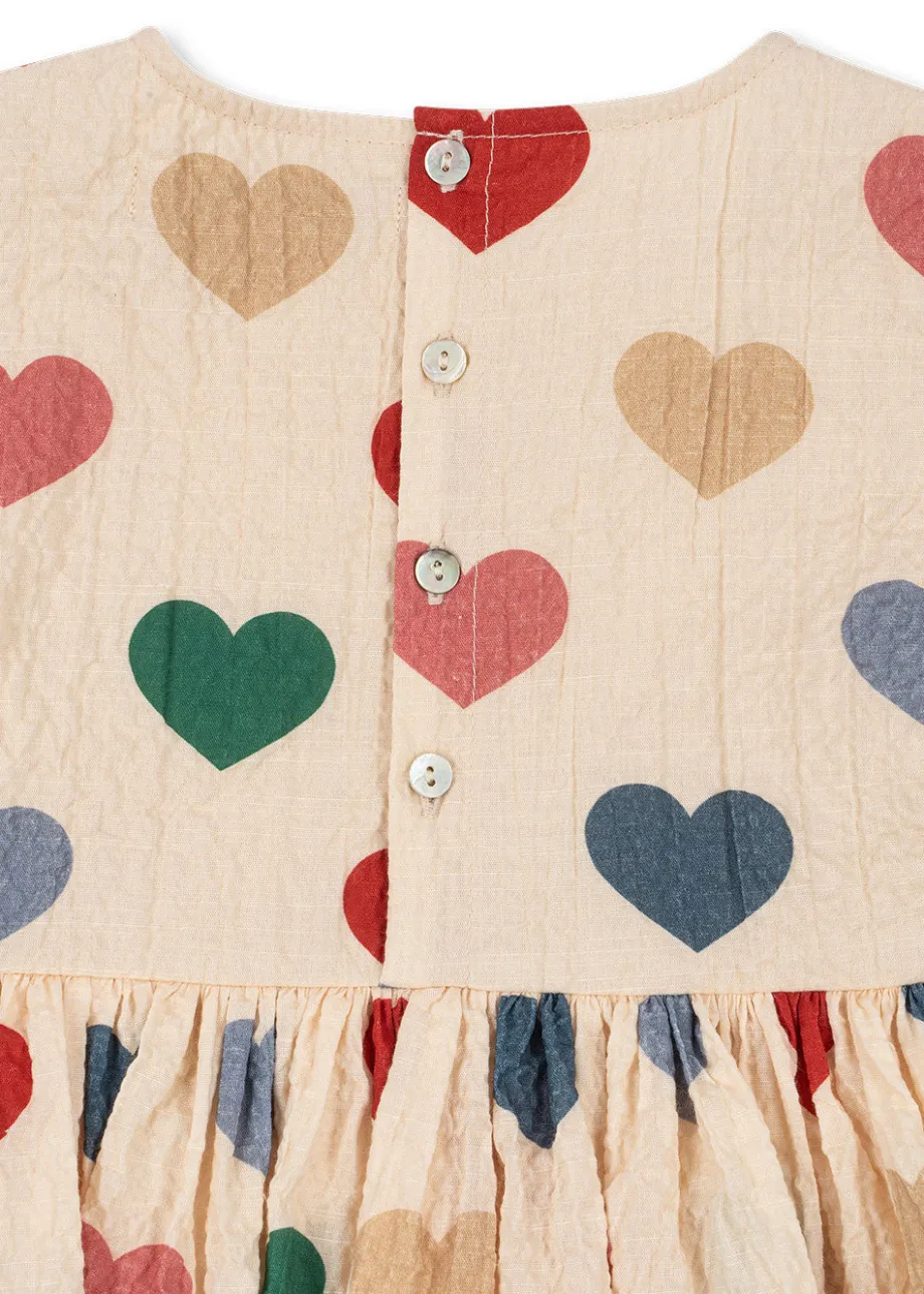 Blød kjole med bæk-og-bølge-effekt. Lukkes med knapper bagpå. Lavet af 98 % økologisk bomuld og 2 % elastan. GOTS. økologisk. certificeret af CU1094701.
