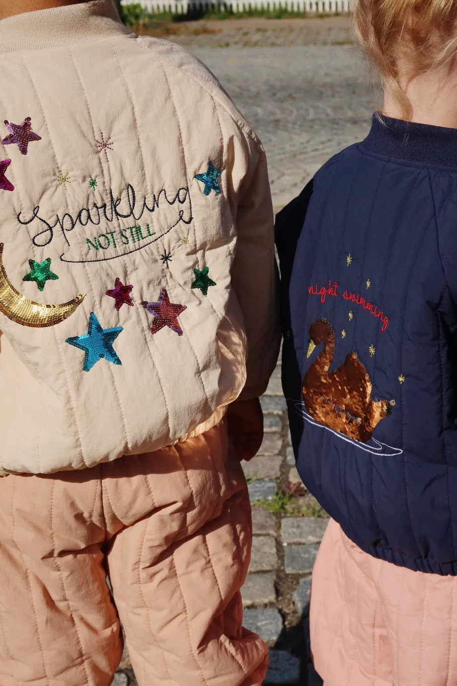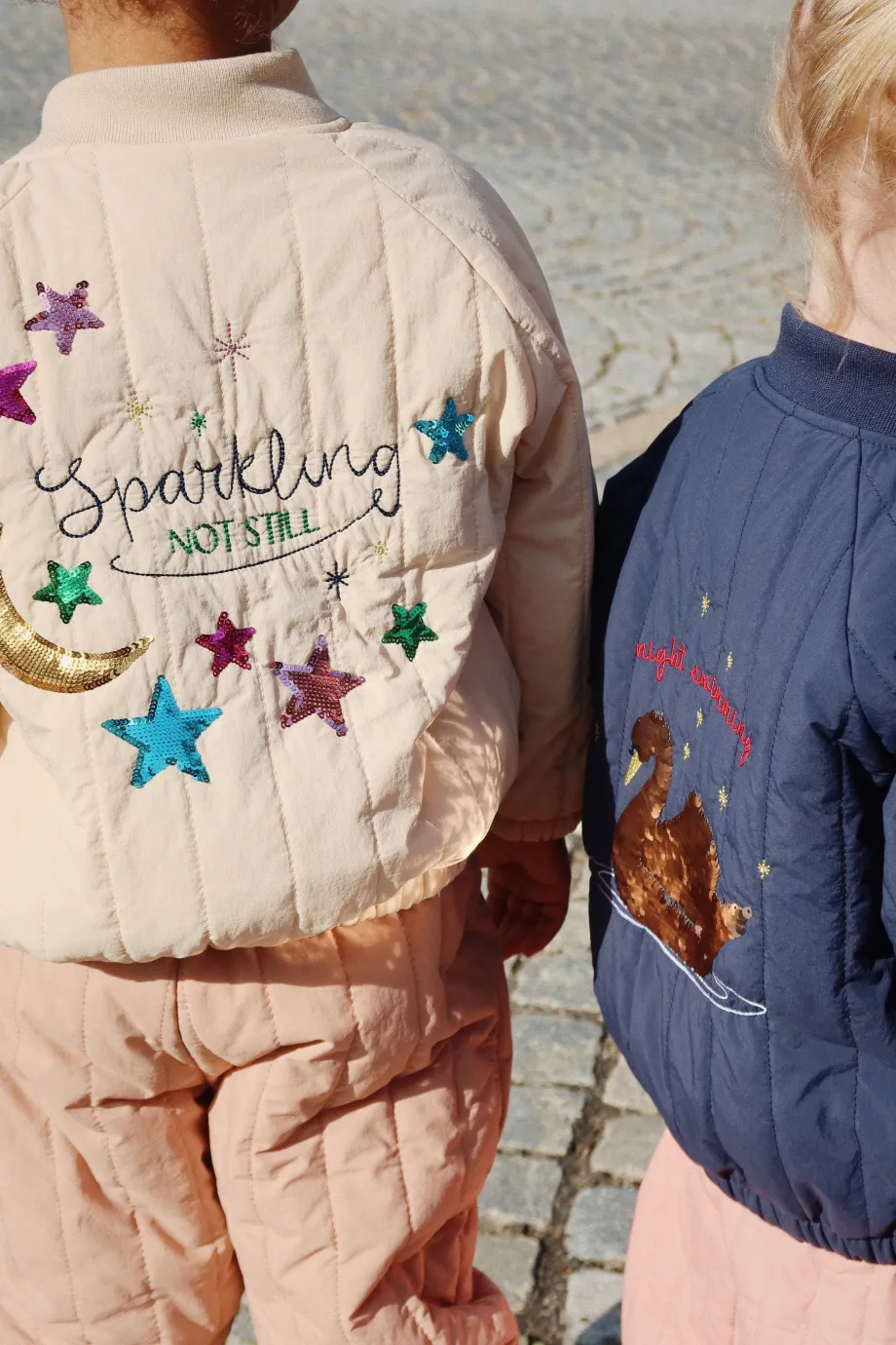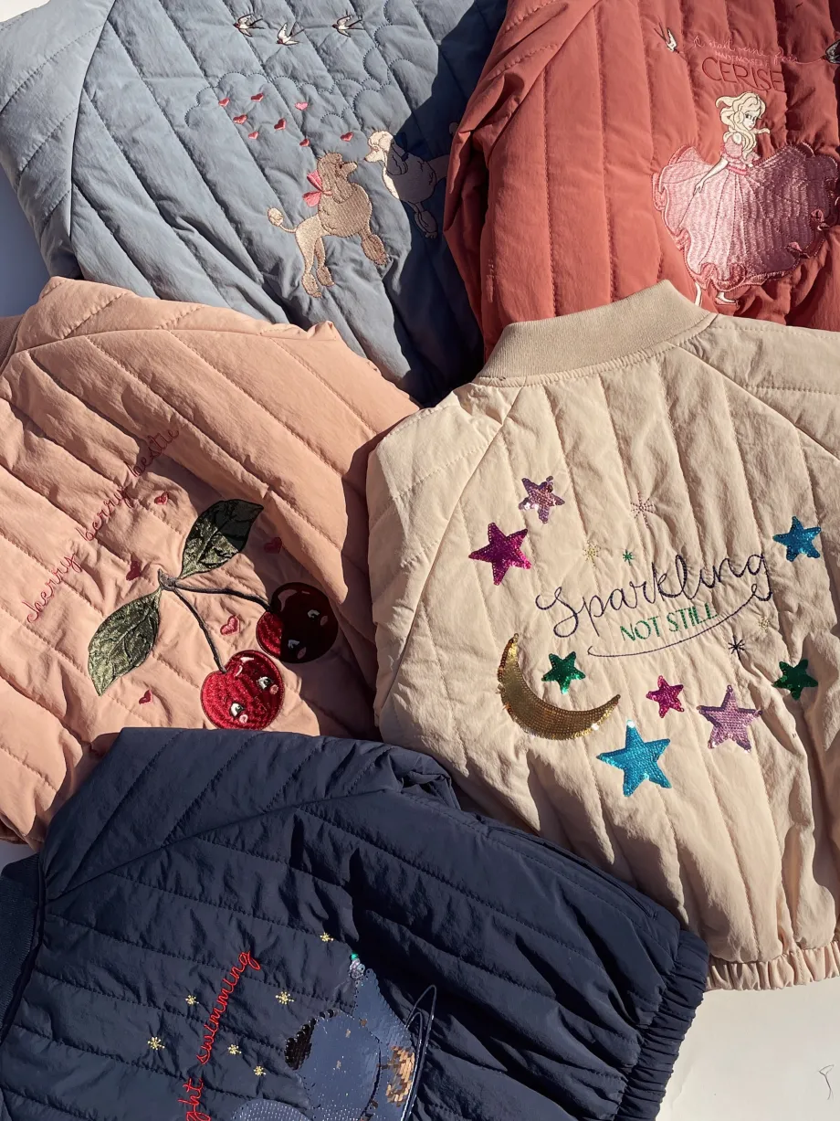 Vandafvisende og vindtæt termojakke med dekorativt pailletmønster på ryggen. Lavet af: Yderlag: 100 % nylon. For: 100 % bomuld og 100 % polyester. Polstring: 100 % polyester. Tekni
