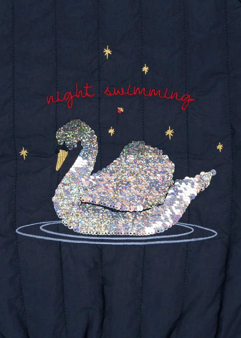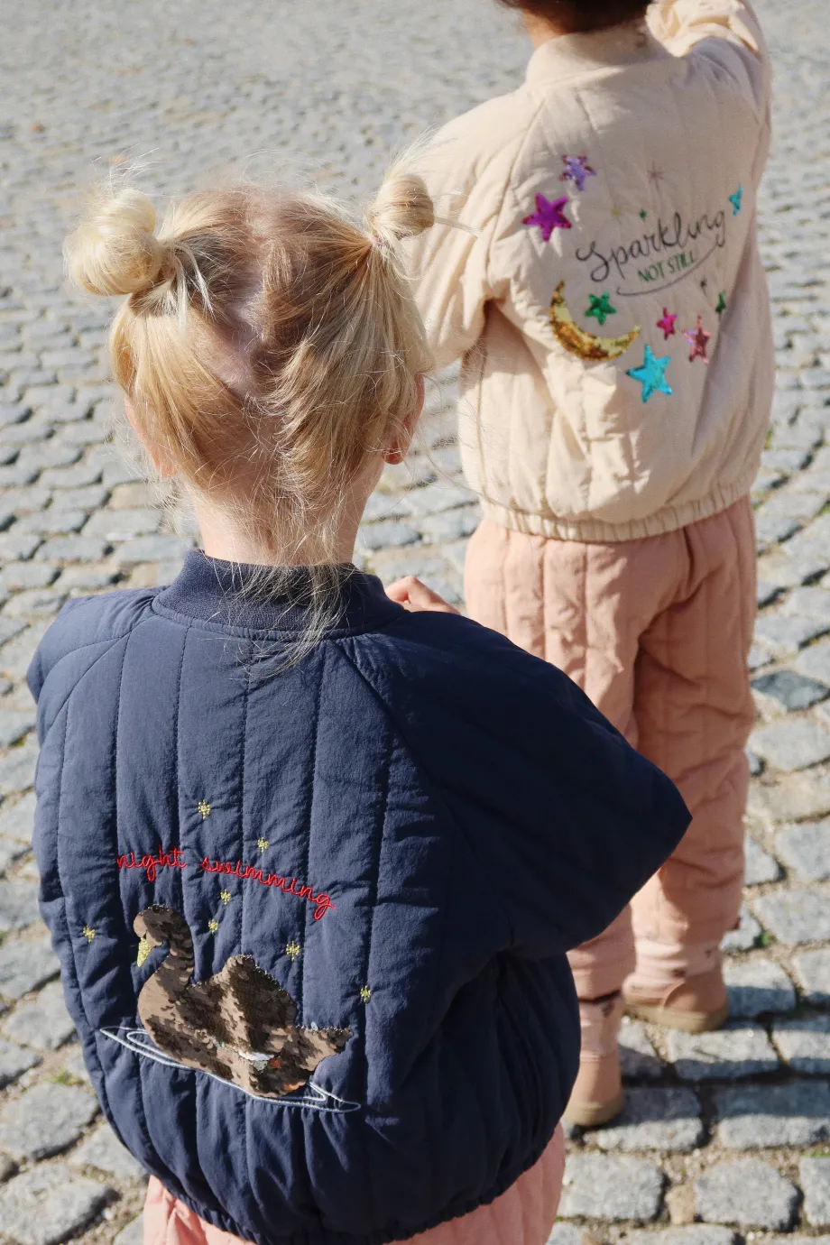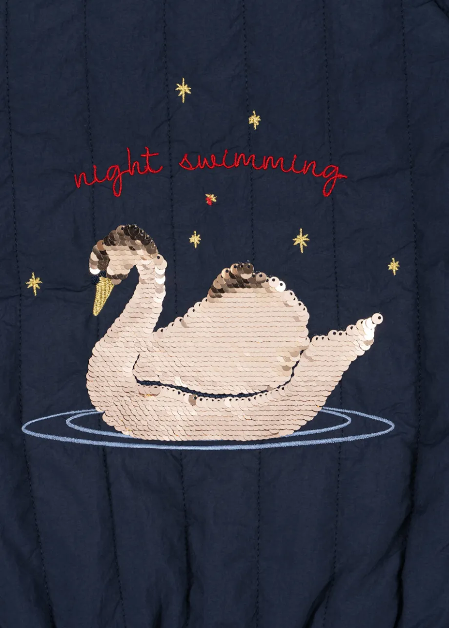 Vandafvisende og vindtæt termojakke med dekorativt pailletmønster på ryggen. Lavet af: Yderlag: 100 % nylon. For: 100 % bomuld og 100 % polyester. Polstring: 100 % polyester. Tekni