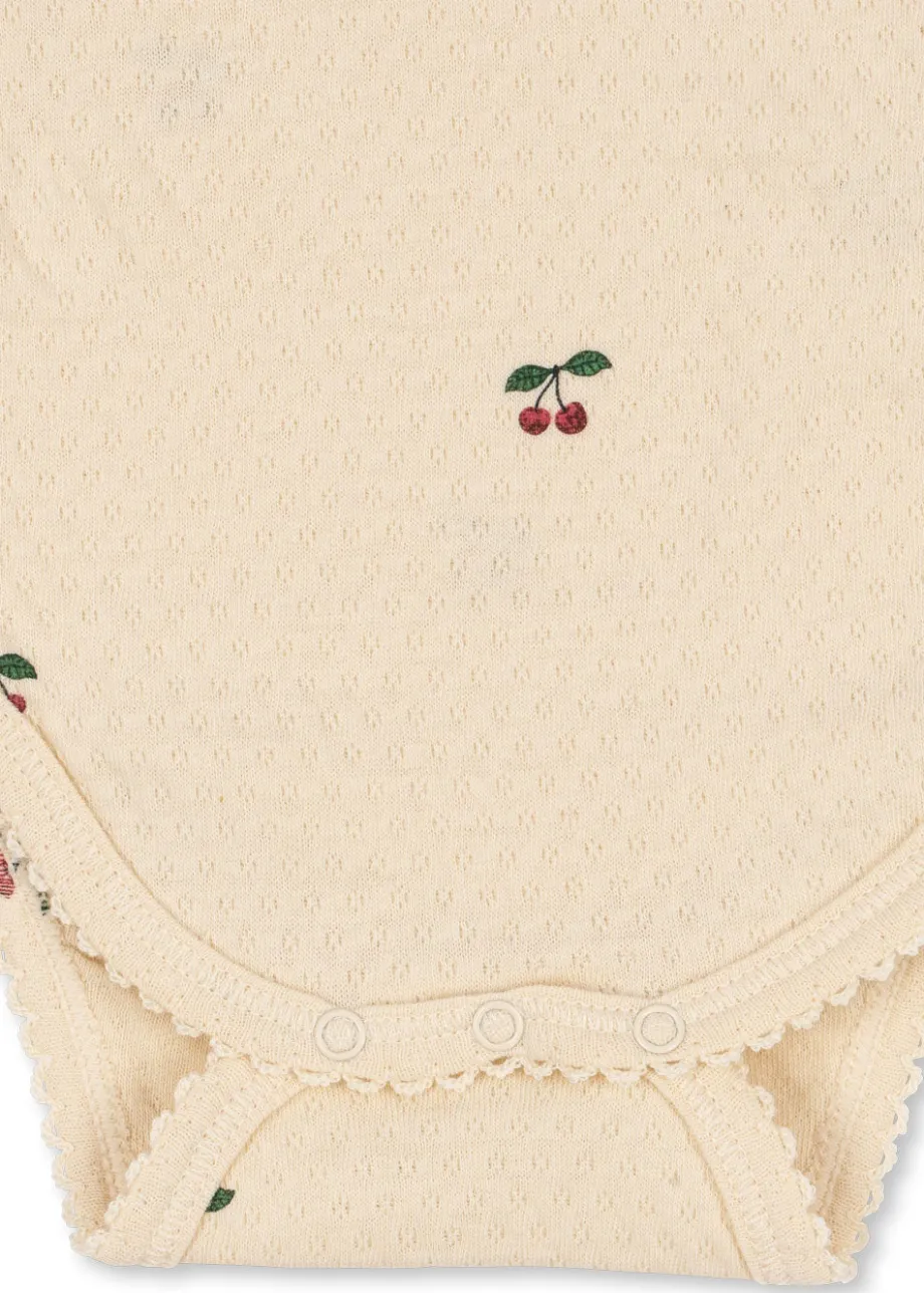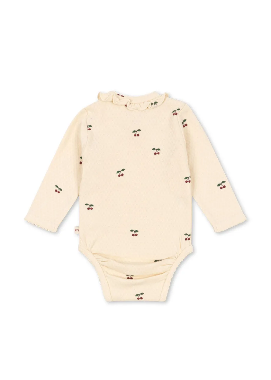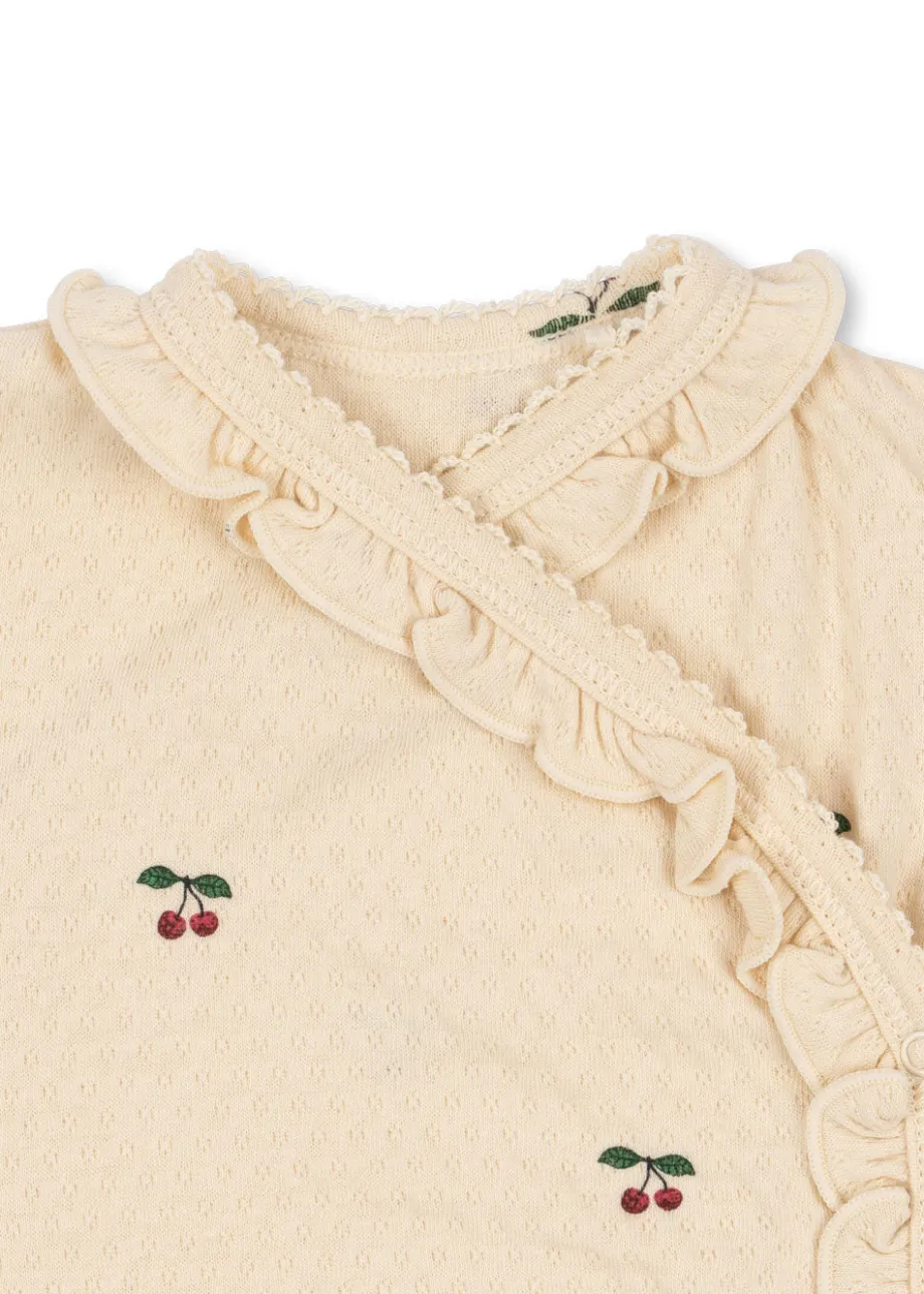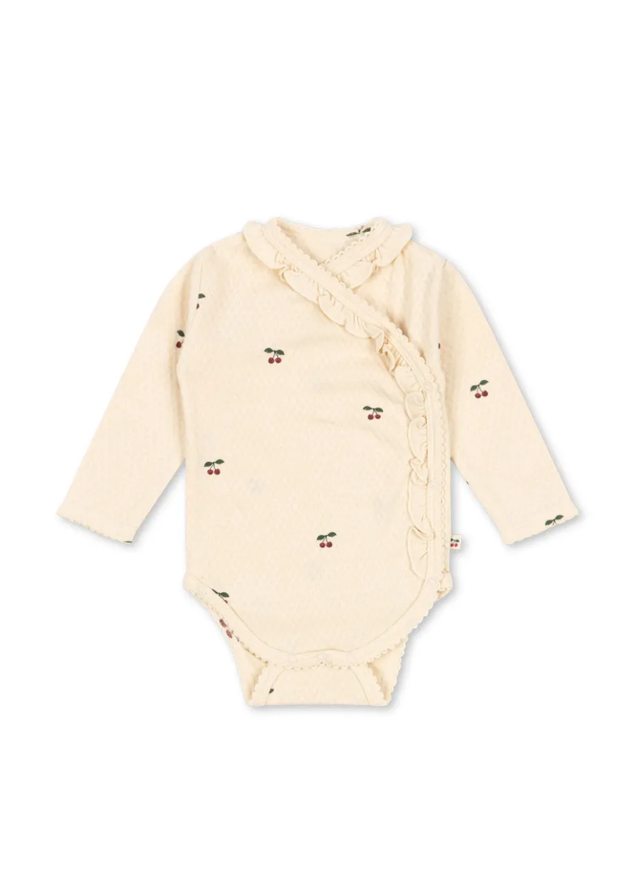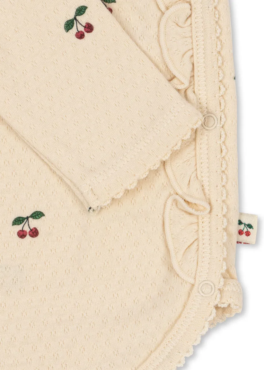 Blød bodystocking i bomuld til nyfødte med slå-om-lukning og flæsedetaljer. Med trykknapper langs kroppen og ved benåbningen. som gør det nemt at klæde barnet på. Lavet af 100 % øk