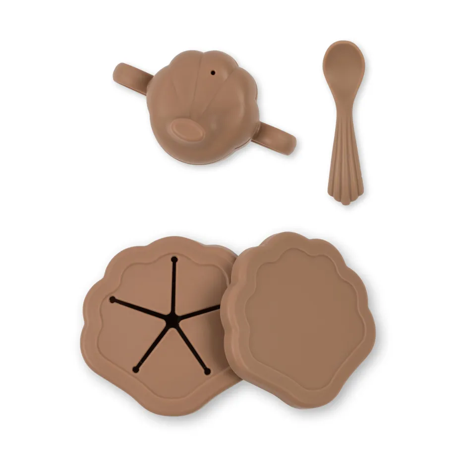 Spisesæt fremstillet i 100% silikone og PP. Sættet indeholder kop med tud. skål med to låg og en ske. Følg rengørings vejledning angivne på produktet. ADVARSEL: Når dette produk