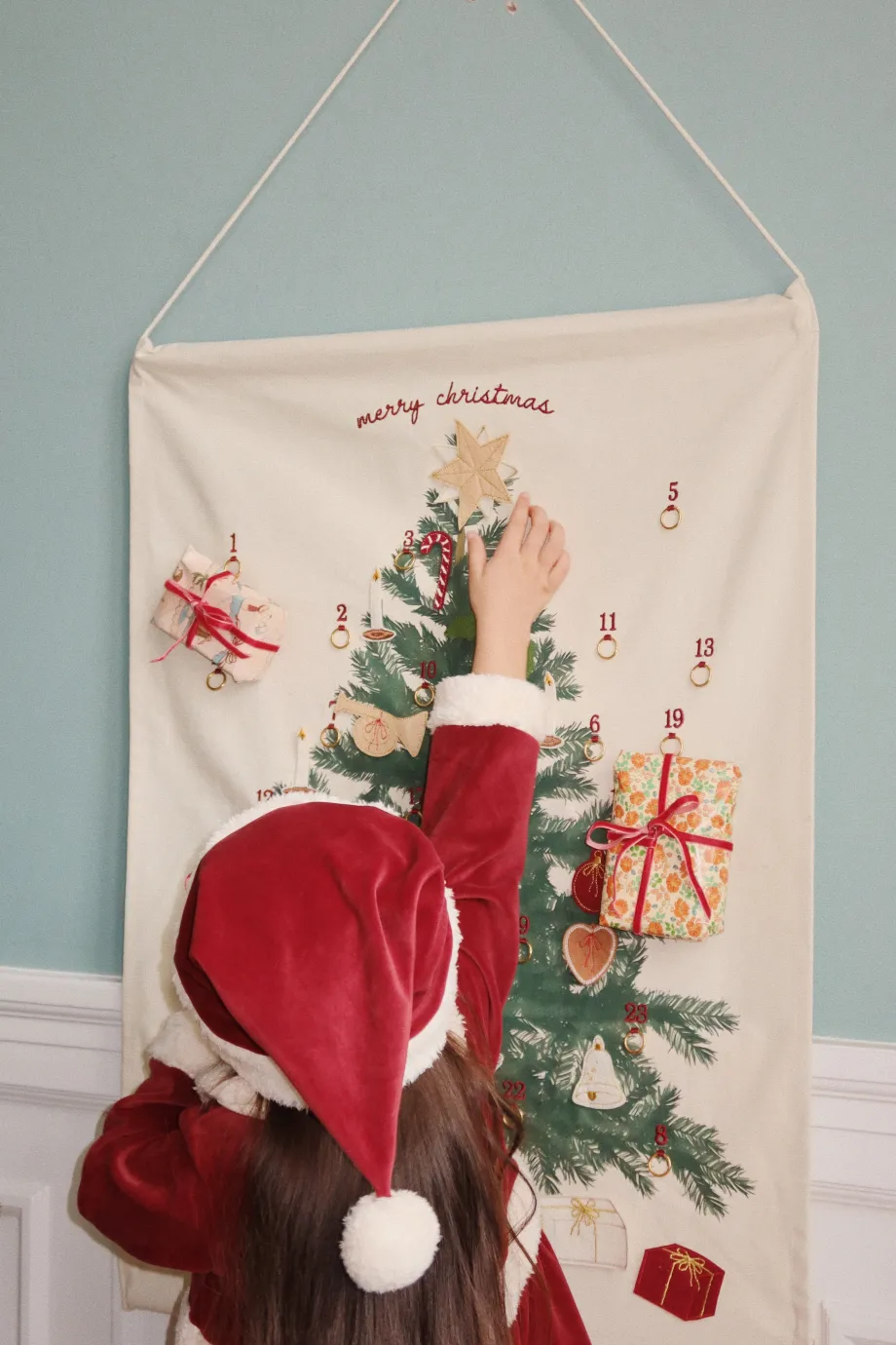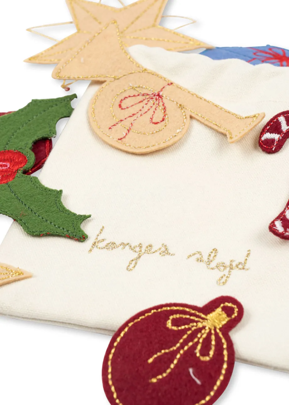 Julekalender. der hjælpe de utålmodige med at tælle ned til jul. Indeholder 24 små ting i en bomuldspose til at pynte julekalenderen med og gøre den mere festlig. Praktisk snor ti