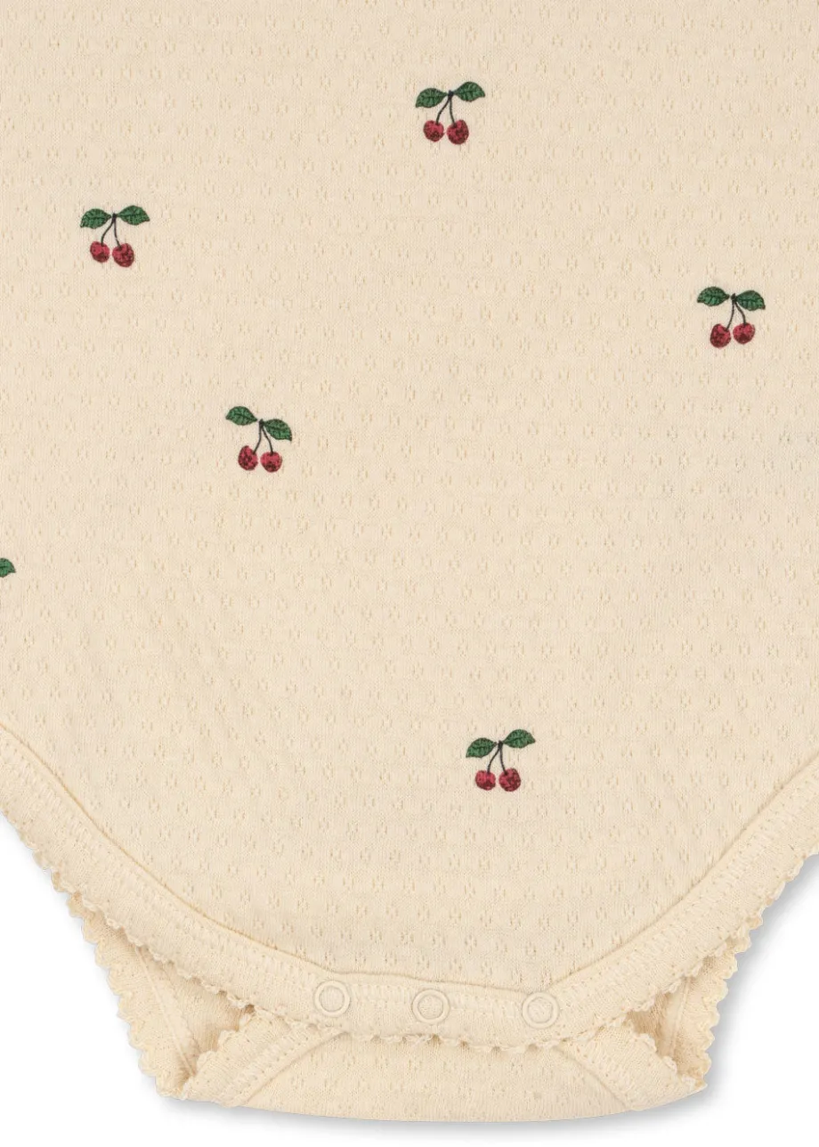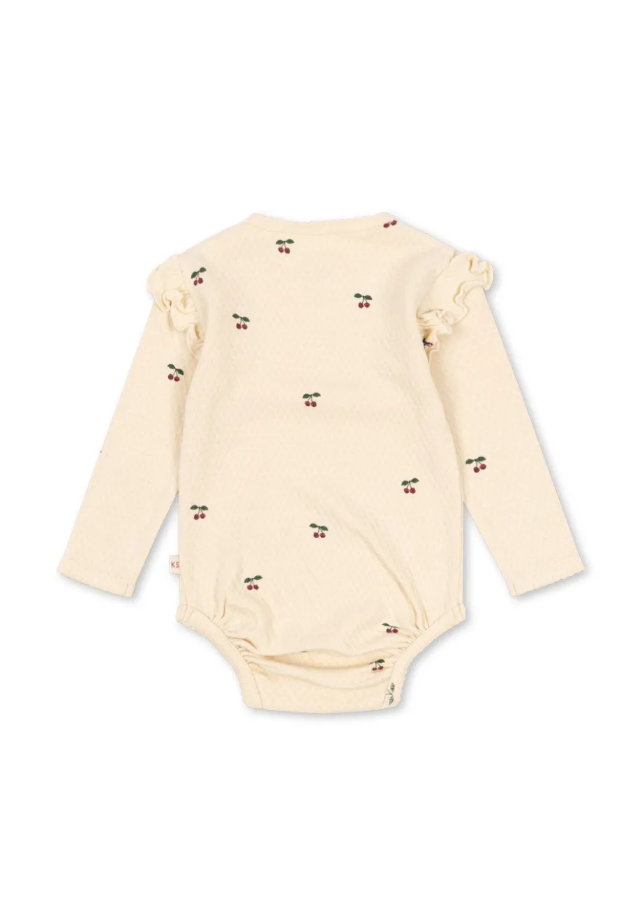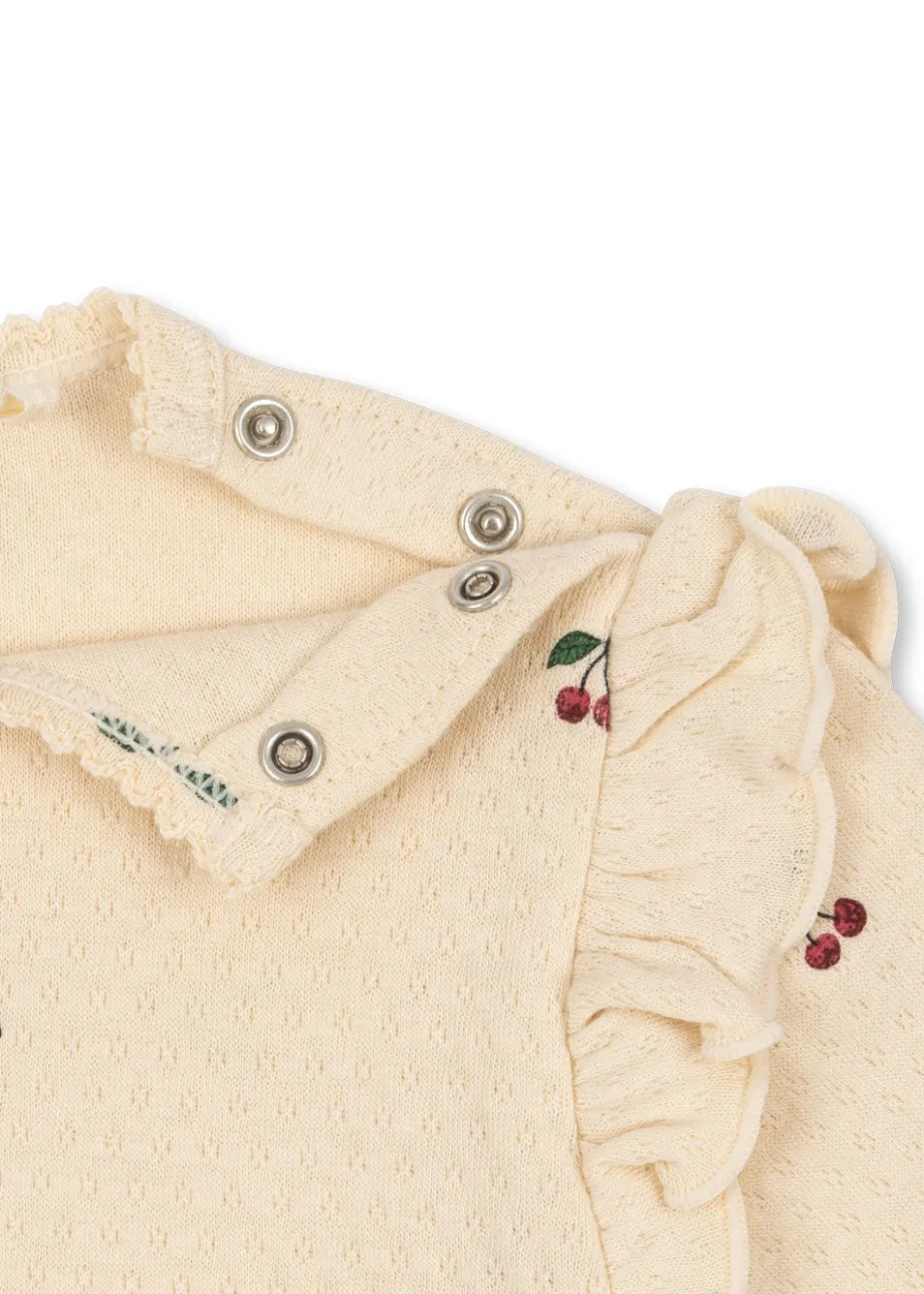 Blød bodystocking i bomuld med flæsedetaljer på skuldrene. Med trykknapper ved benåbningen. som gør det nemt at klæde barnet på. Lavet af 100 % økologisk bomuld. GOTS. økologisk. c