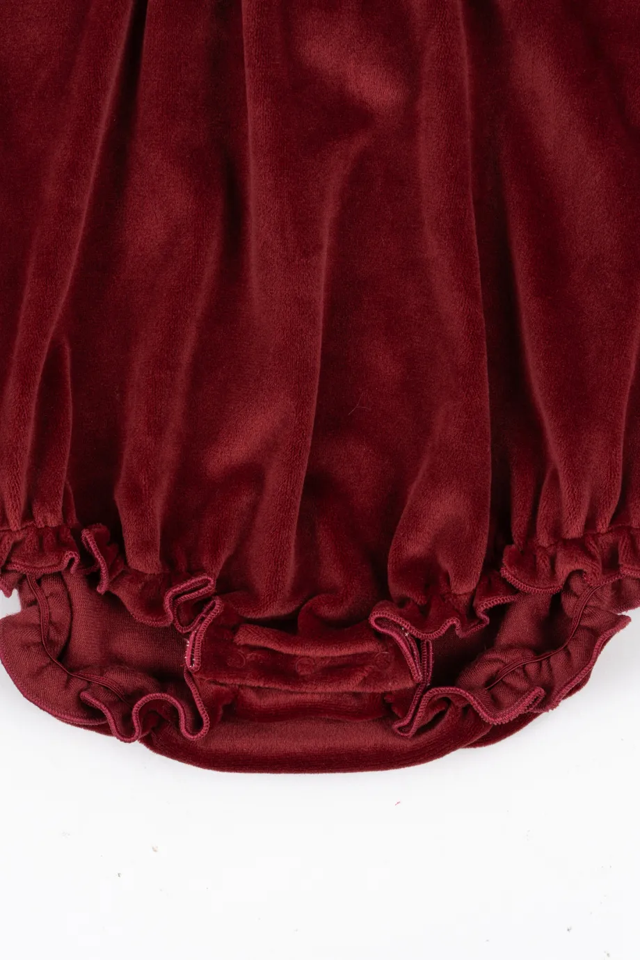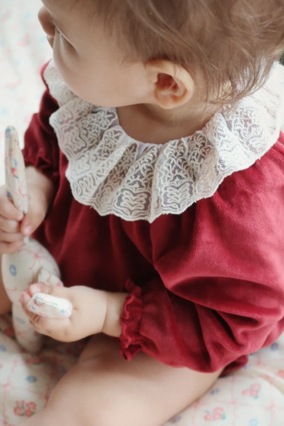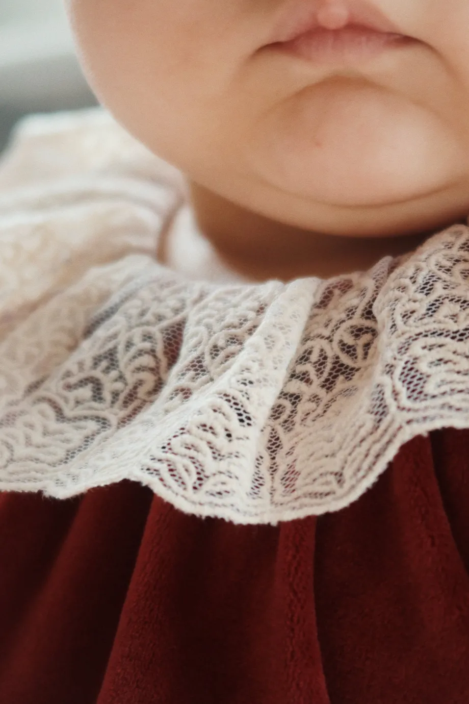 Blød velour-romper med blondekrave og trykknapper i skridtet. der gør den nem at få på. Lavet af 95 % genanvendt polyester og 5 % elastan Dette produkt indeholder mindst 50 % GRS