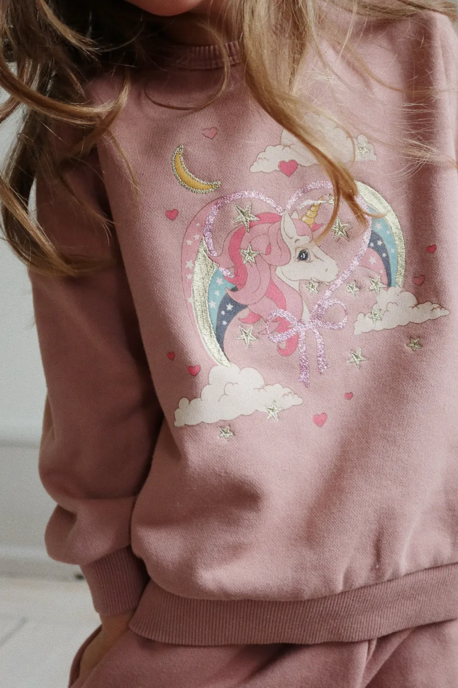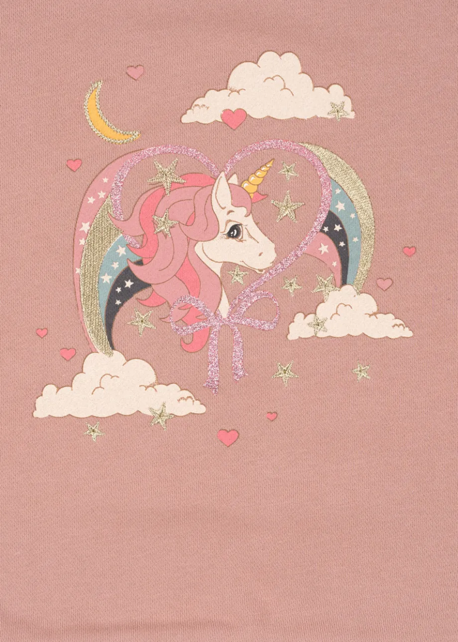 Den klassiske Lou sweatshirt med dekorativt glimmerprint. Bemærk: Sweatshirts op til størrelse 18 M er designet med trykknapper på skulderen. så de er nemmere at få ned over barnet