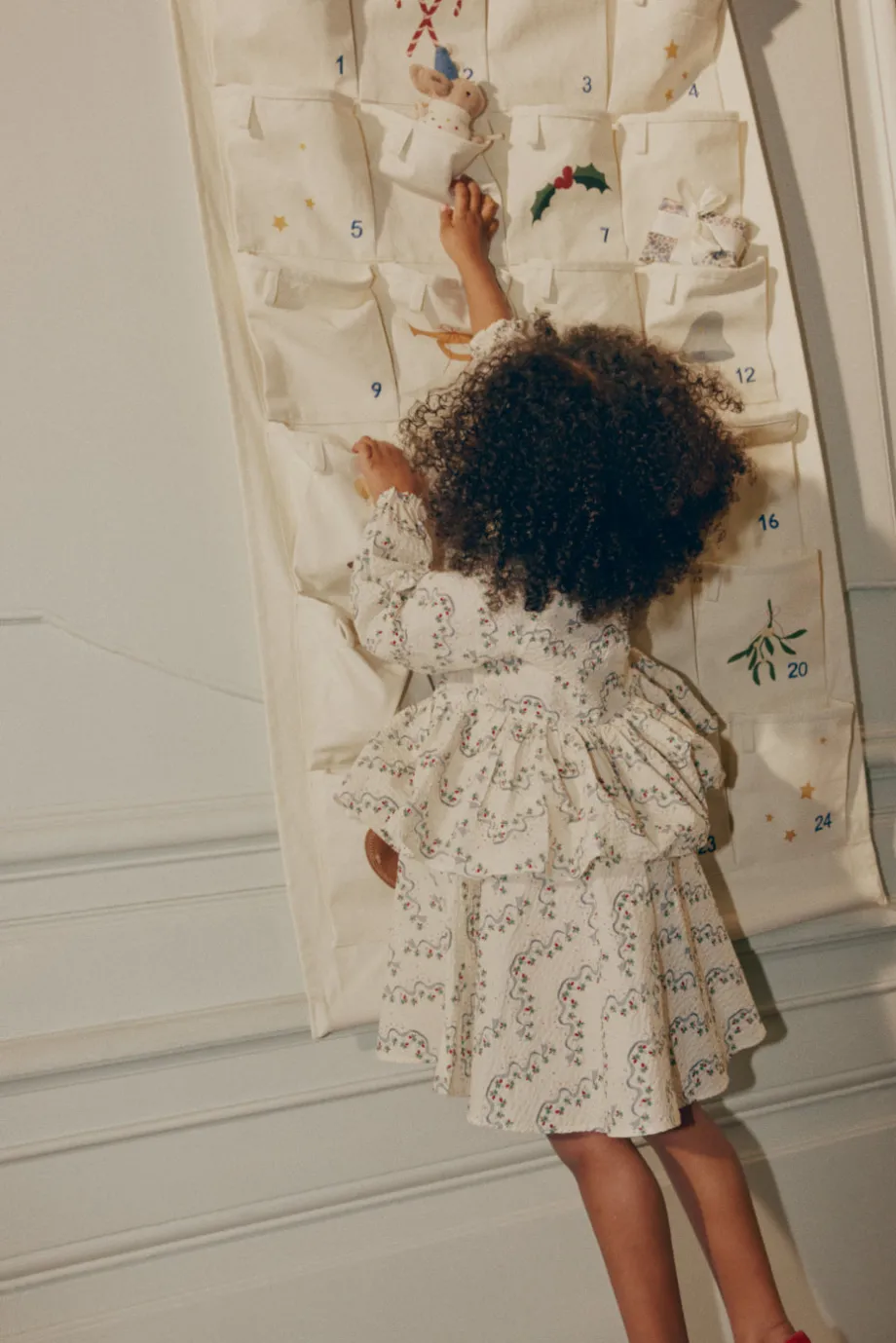 Julekalender med juleprint og 24 lommer til at gemme små gaver i. Praktisk snor øverst til at hænge julekalenderen op med. Fremstillet af 100 % bomuld med pind af 100 % bøgetræ B