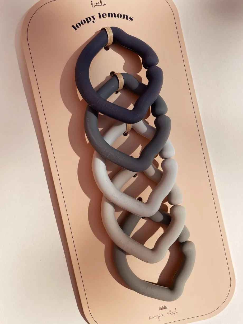 Loopy Lemons-ringene er lavet til at hænge legetøj på aktivitetsstativet med. som babyen kan se på og lege med Fås i 5-pak – vælg mellem to farvesæt Fremstillet i 100 % silikone