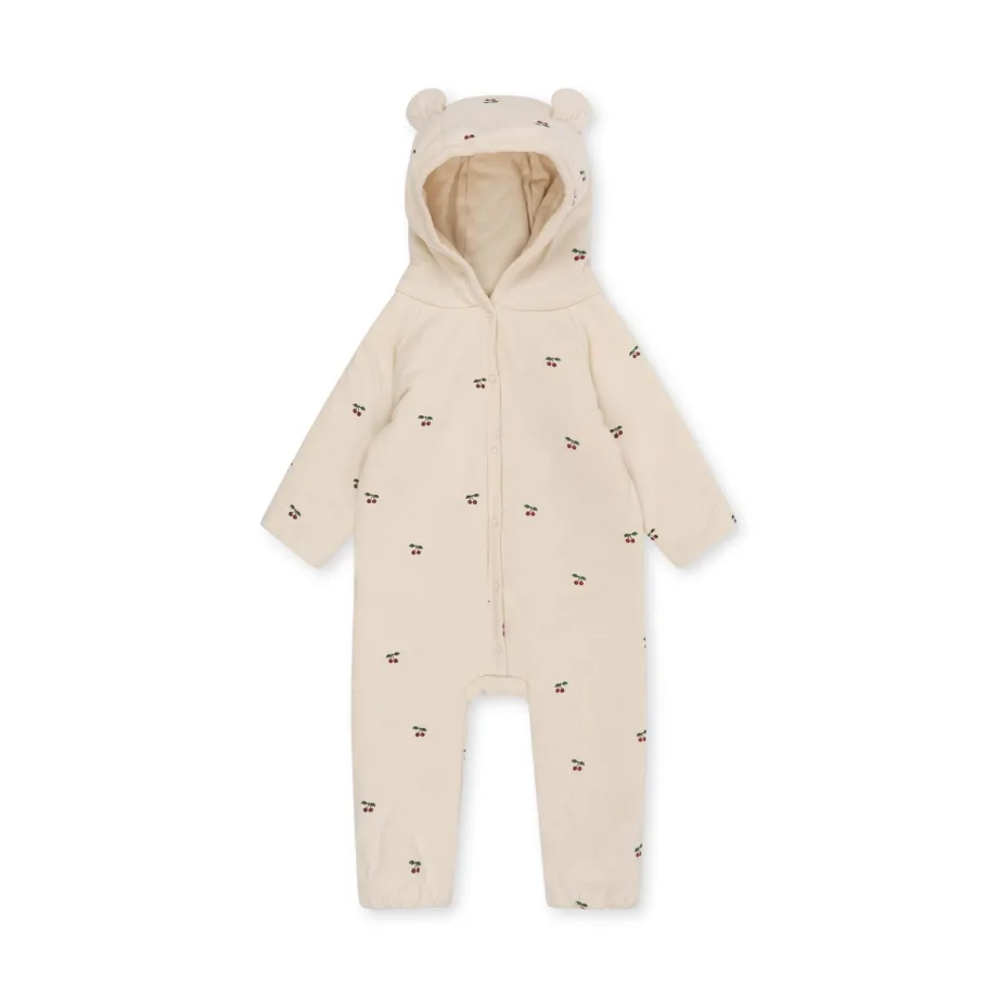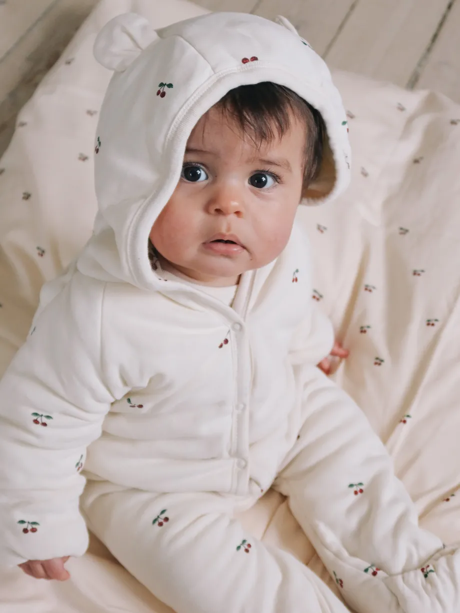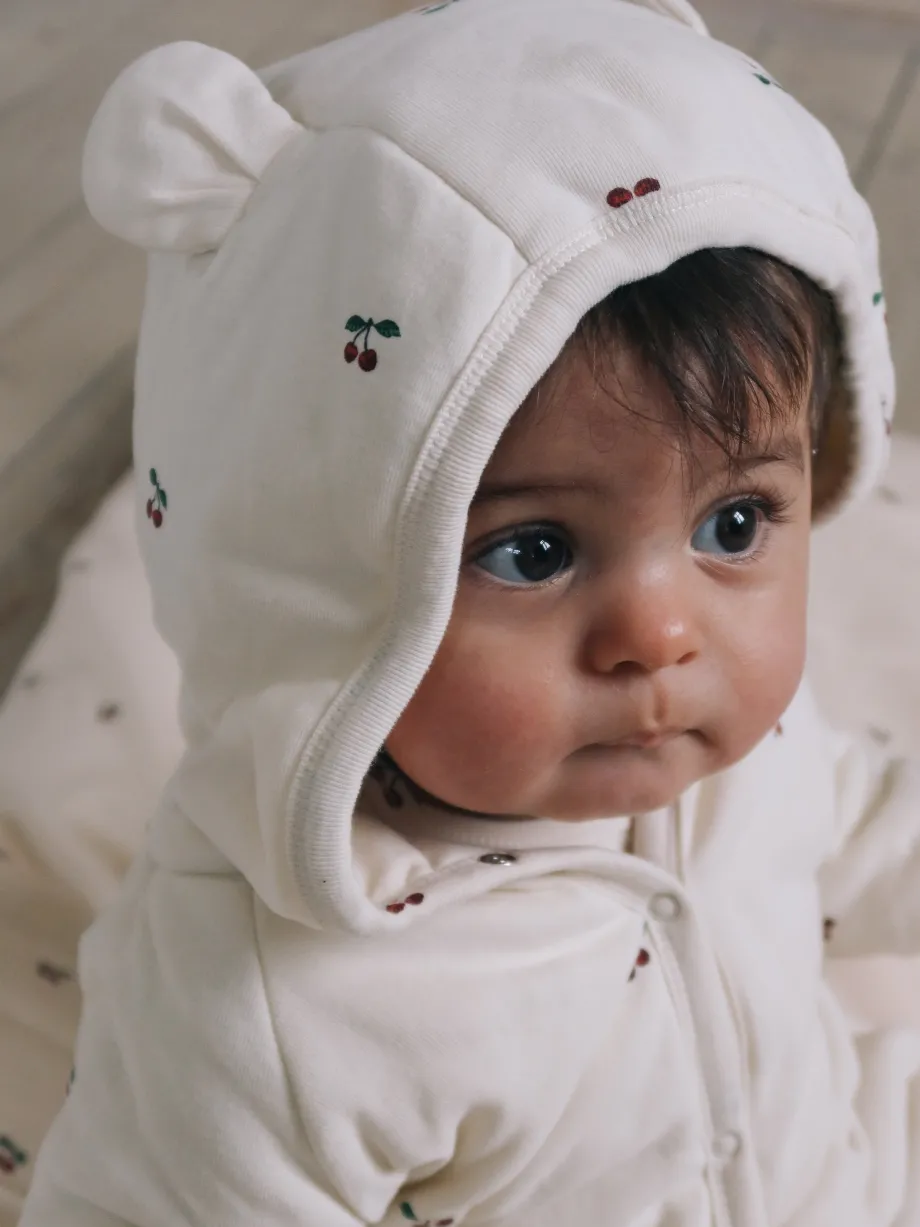 Vores let-vatteret newborn-onesie med hætte har de sødeste små ører og er lavet med foldbare hænder og fødder. Vælg mellem forskellige farver og print. Fremstillet i 100 % økologis