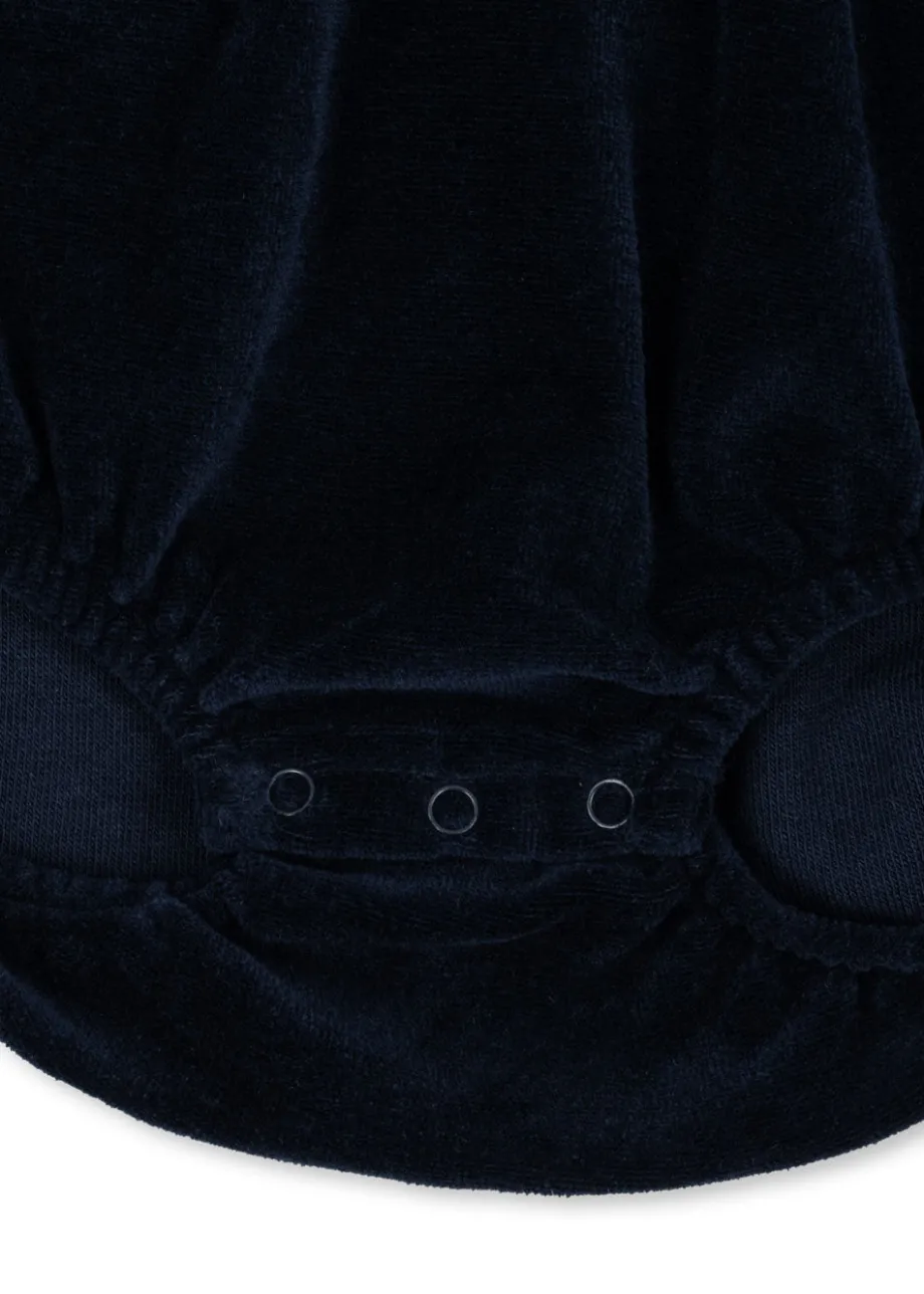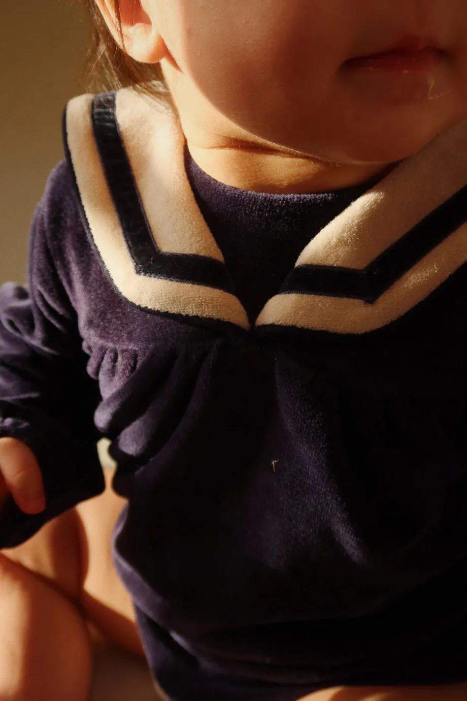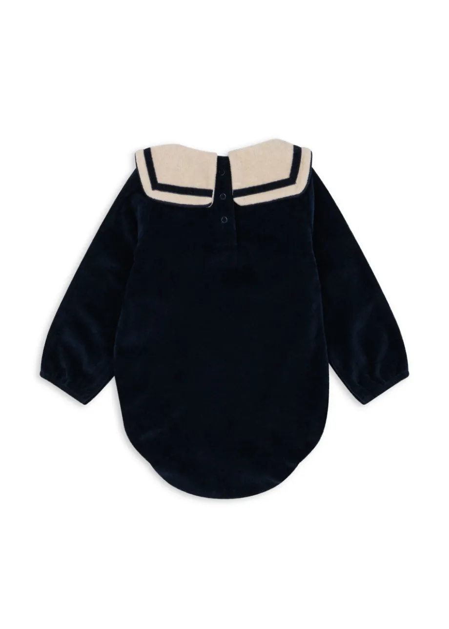 Blød romper i velour med sømandsdetaljer. Lavet af 80 % økologisk bomuld og 20 % polyester GOTS. lavet af 80 % økologiske materialer. certificeret af CU1094701