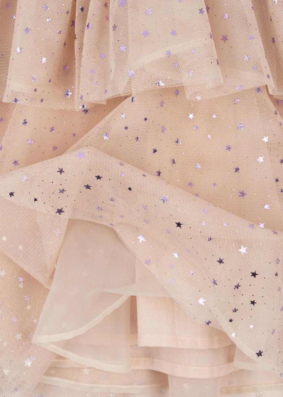 Kjole med tylskørt og en stor. rund krave. Lukkes bagpå med en enkelt perlemorsknap. Lavet af 100 % polyester med 100 % bomuldsfor. Dette produkt er certificeret i henhold til OEKO
