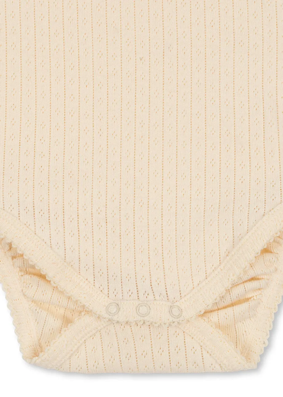 Blød bodystocking i bomuld med dekorativt hulmønster. Med praktiske trykknapper i skridtet. Et blød og behagelig basisbluse. der er uundværlig i garderoben. Lavet af 100 % økolo