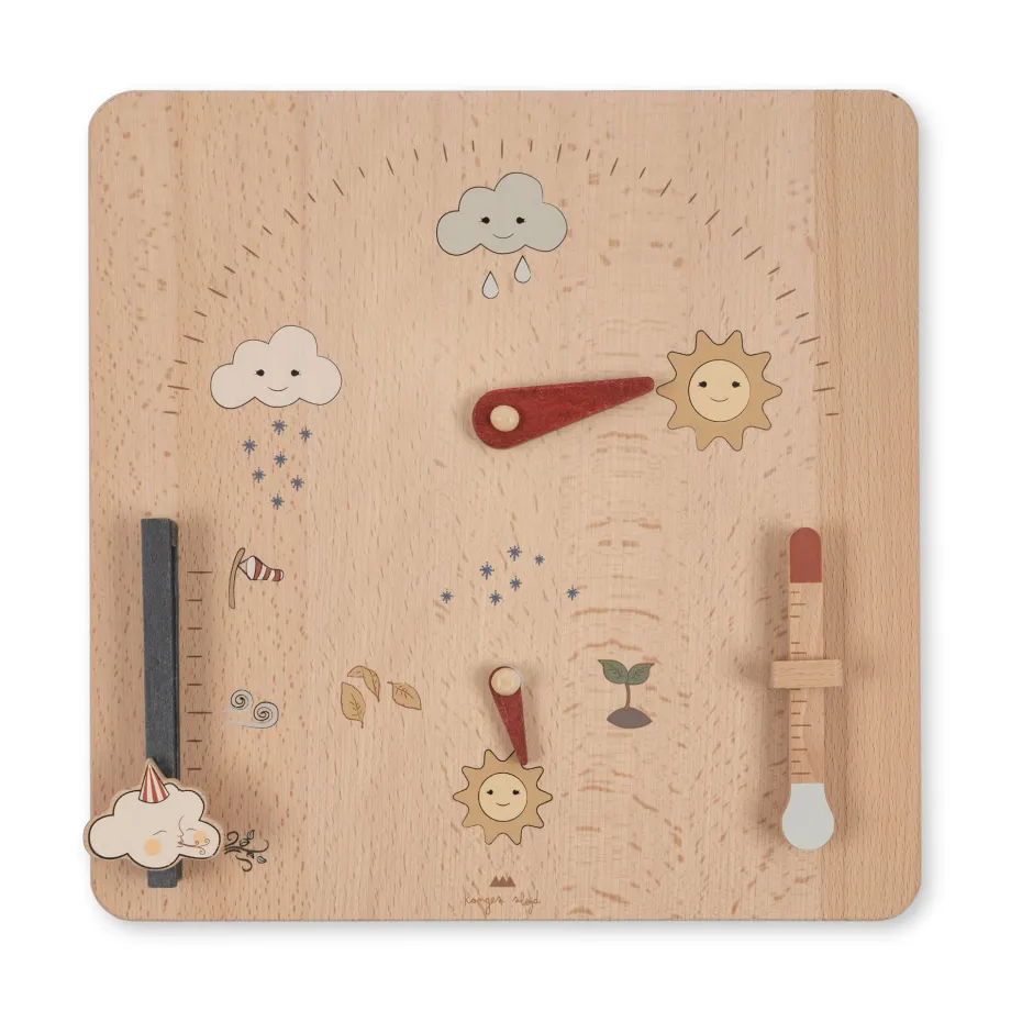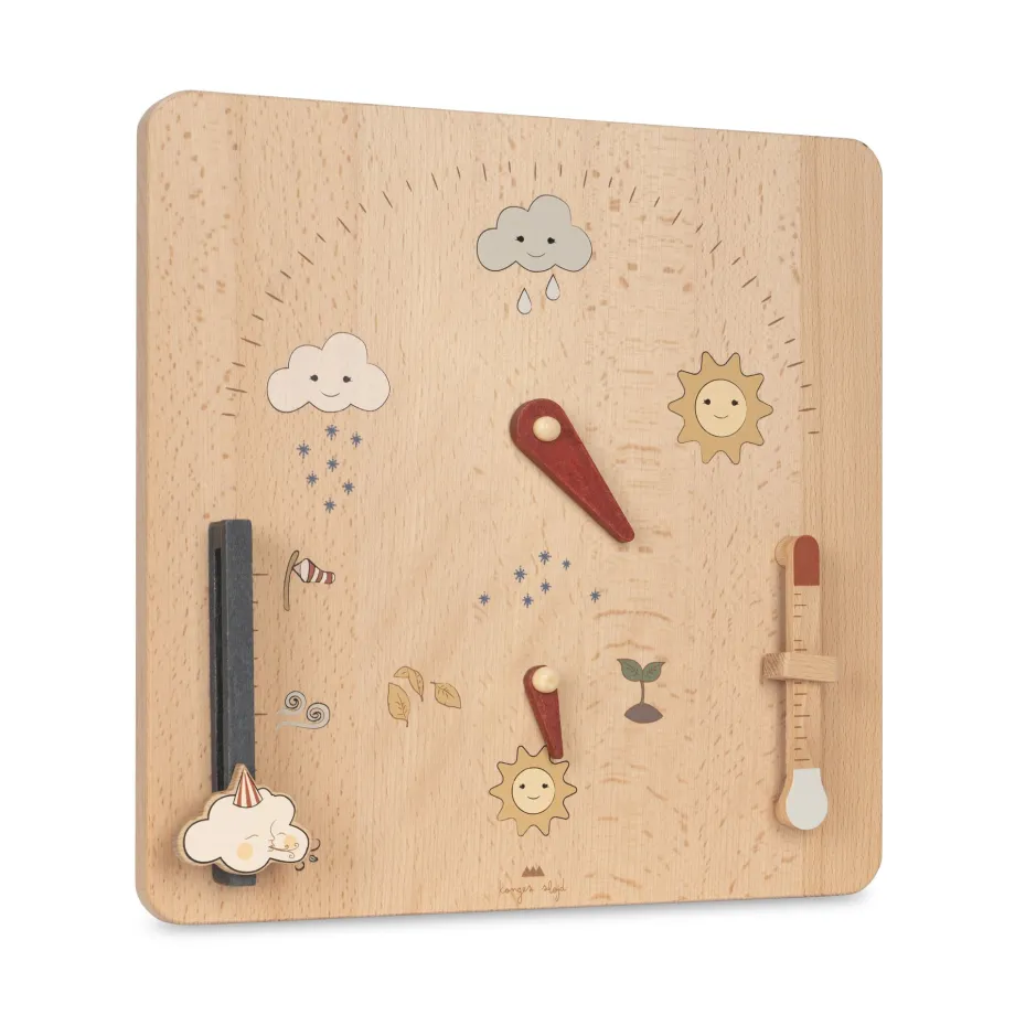 Vejrstation lavet af bøgetræ. Fortæl historier om vejret med hjælp fra små vejrikoner og årstidssymboler. Mål: 30×30 cm Dette produkt er lavet af FSC™-certificeret bøgetræ Licensnu