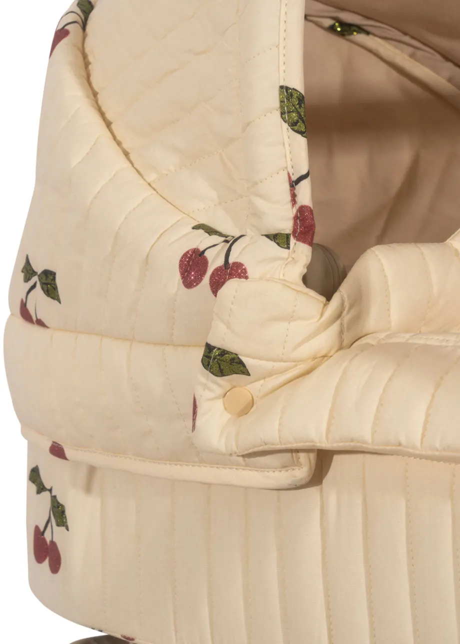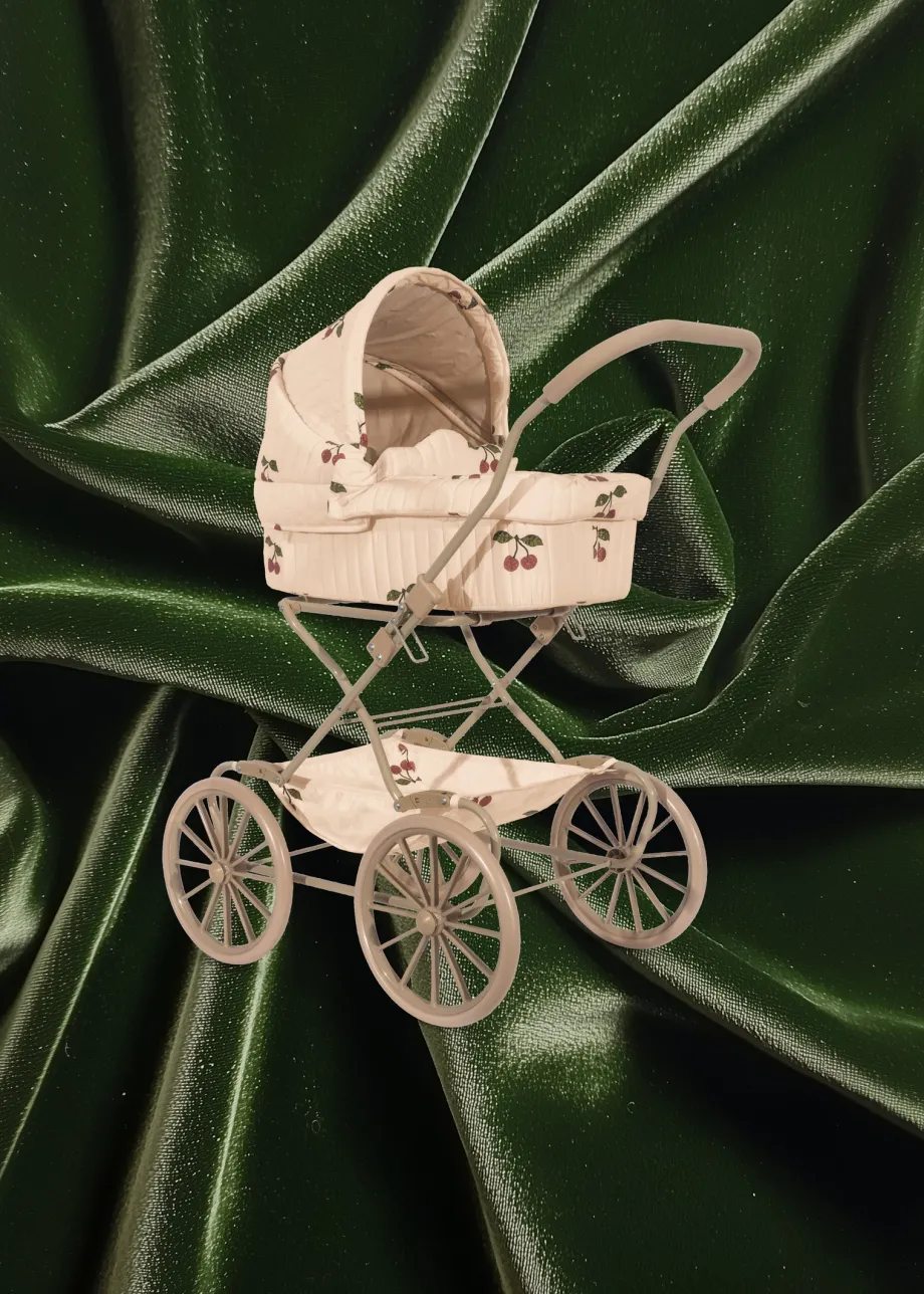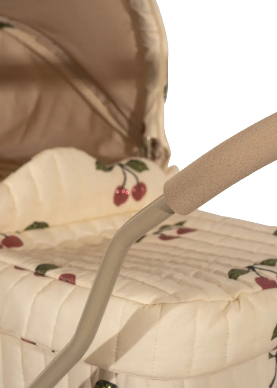 Dukkebarnevogn i vintagestil med fire store hjul. Med quiltet stof. dekorativ muslingekant og polstret madras. Med en blød. polstret opbevaringskurv under liften. Stellet er lavet