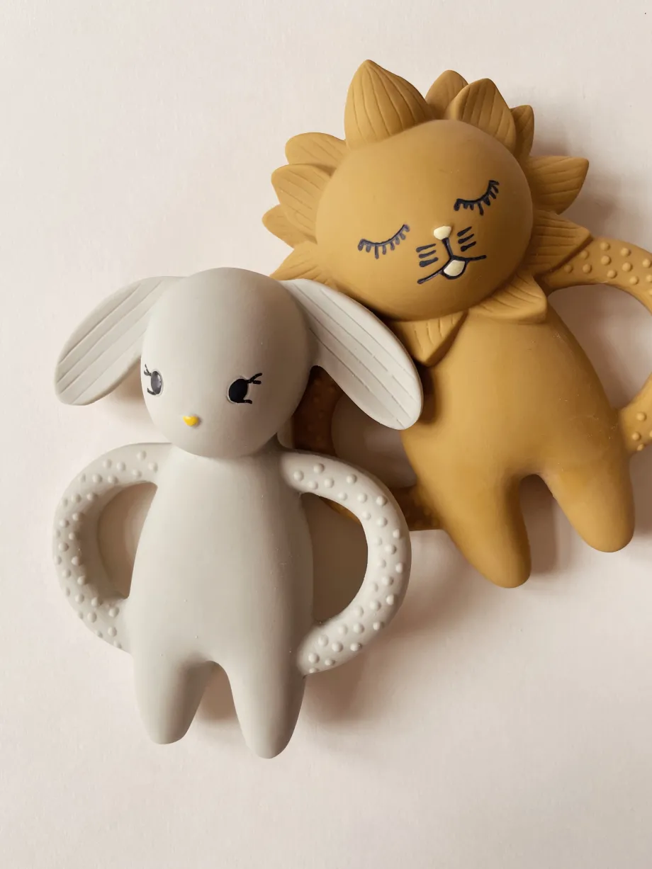 Søde dyr fremstillet i 100 % naturgummi til at berolige babyens ømme gummer. Hver tekstur på gummilegetøjet stimulerer barnets synssans. hørelse. lugtesans. berøring og smag. Gummi