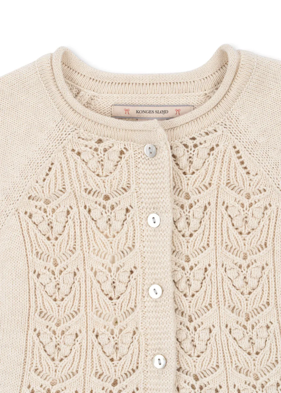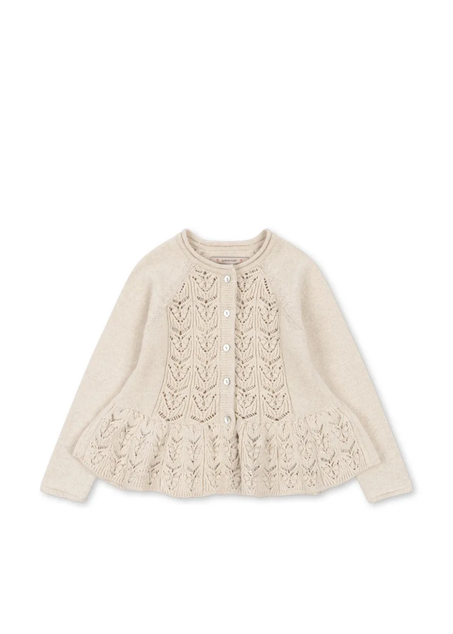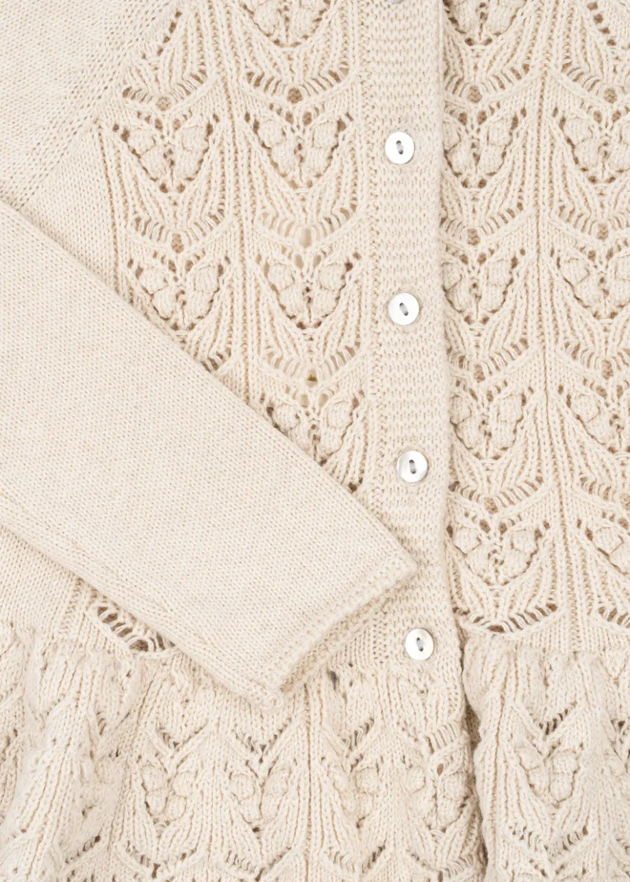 Blød cardigan med rullekant ved halsen og flæsedetaljer. Designet i et dekorativt strikket mønster med perlemorsknapper foran. Off-white melange: lavet af 100 % økologisk bomuld. P