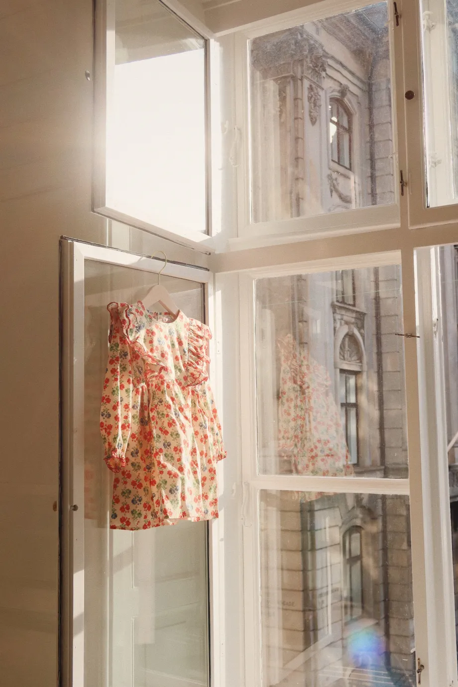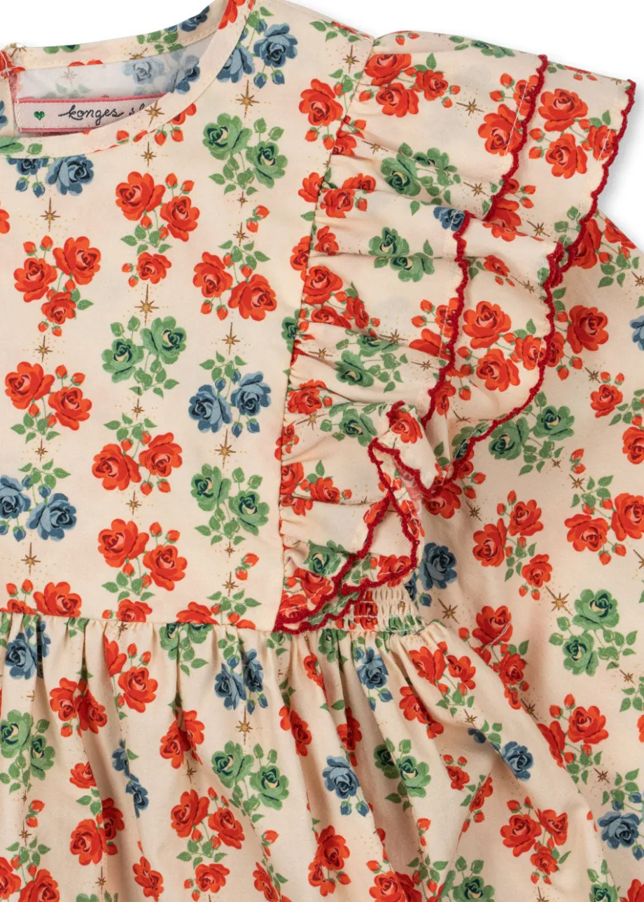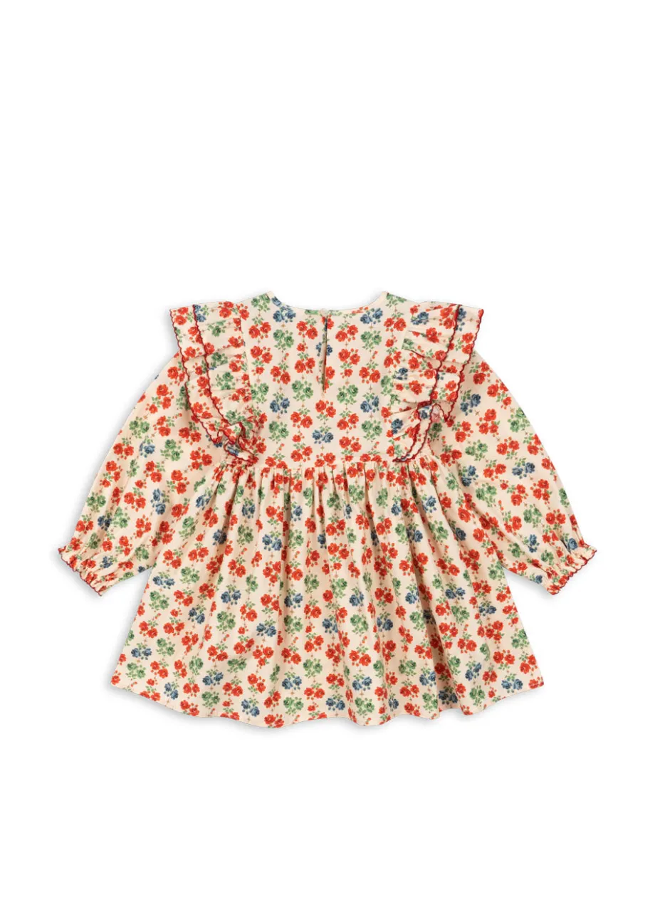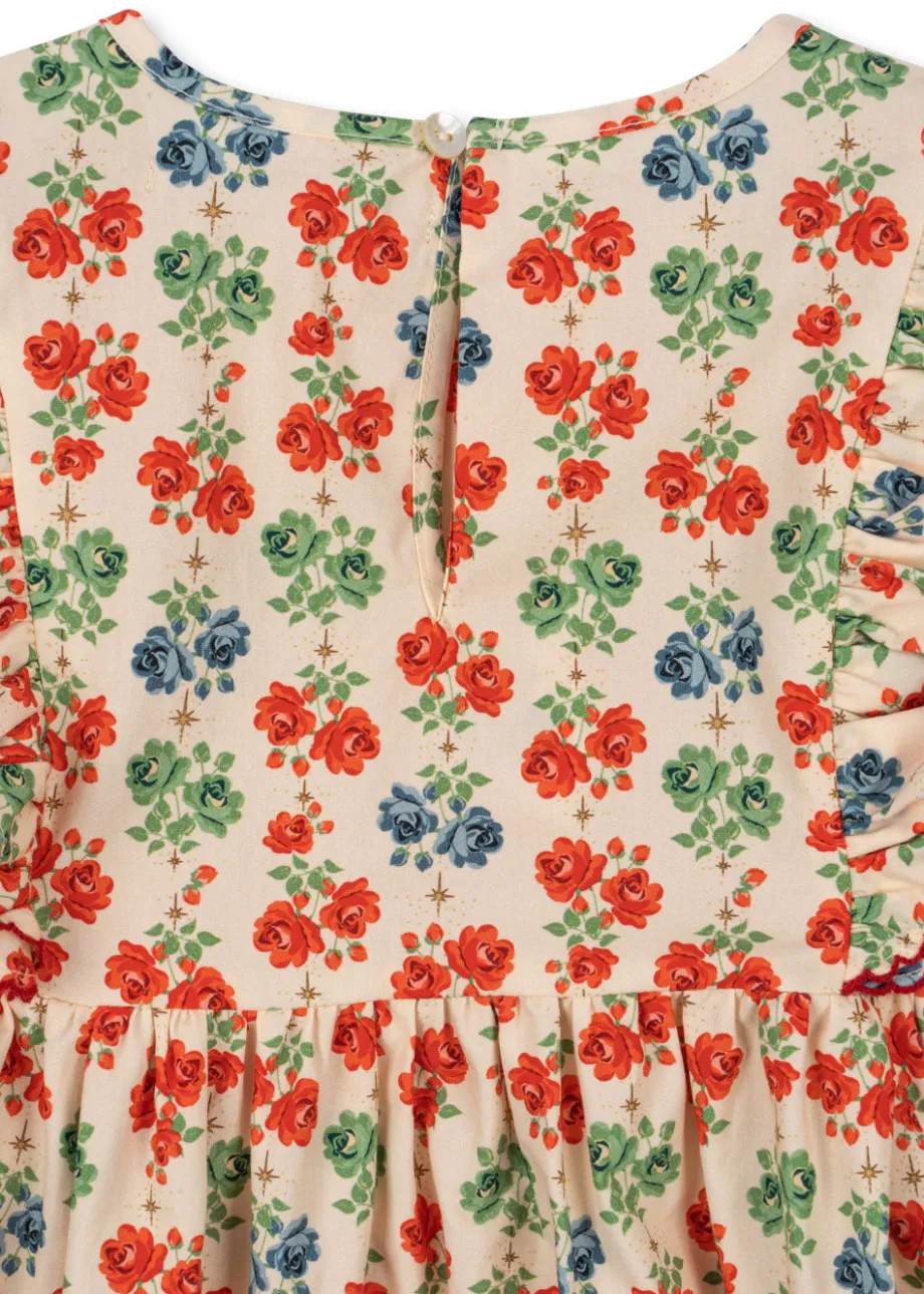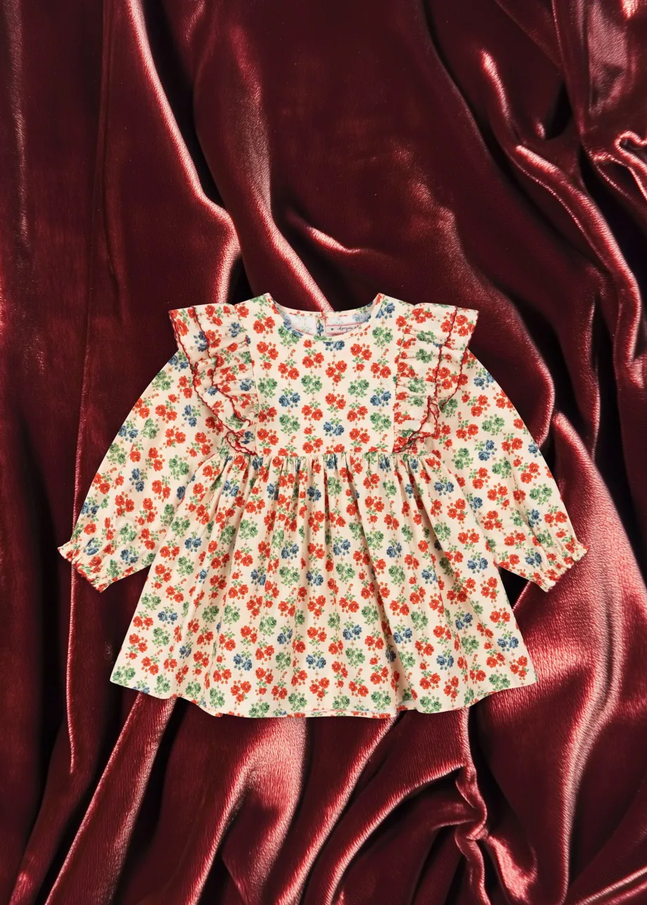 Vævet bomuldskjole med flæsedetaljer ved skuldrene og skørt med vidde. Fremstillet af 100% økologisk bomuld GOTS. økologisk. certificeret af CU1094701