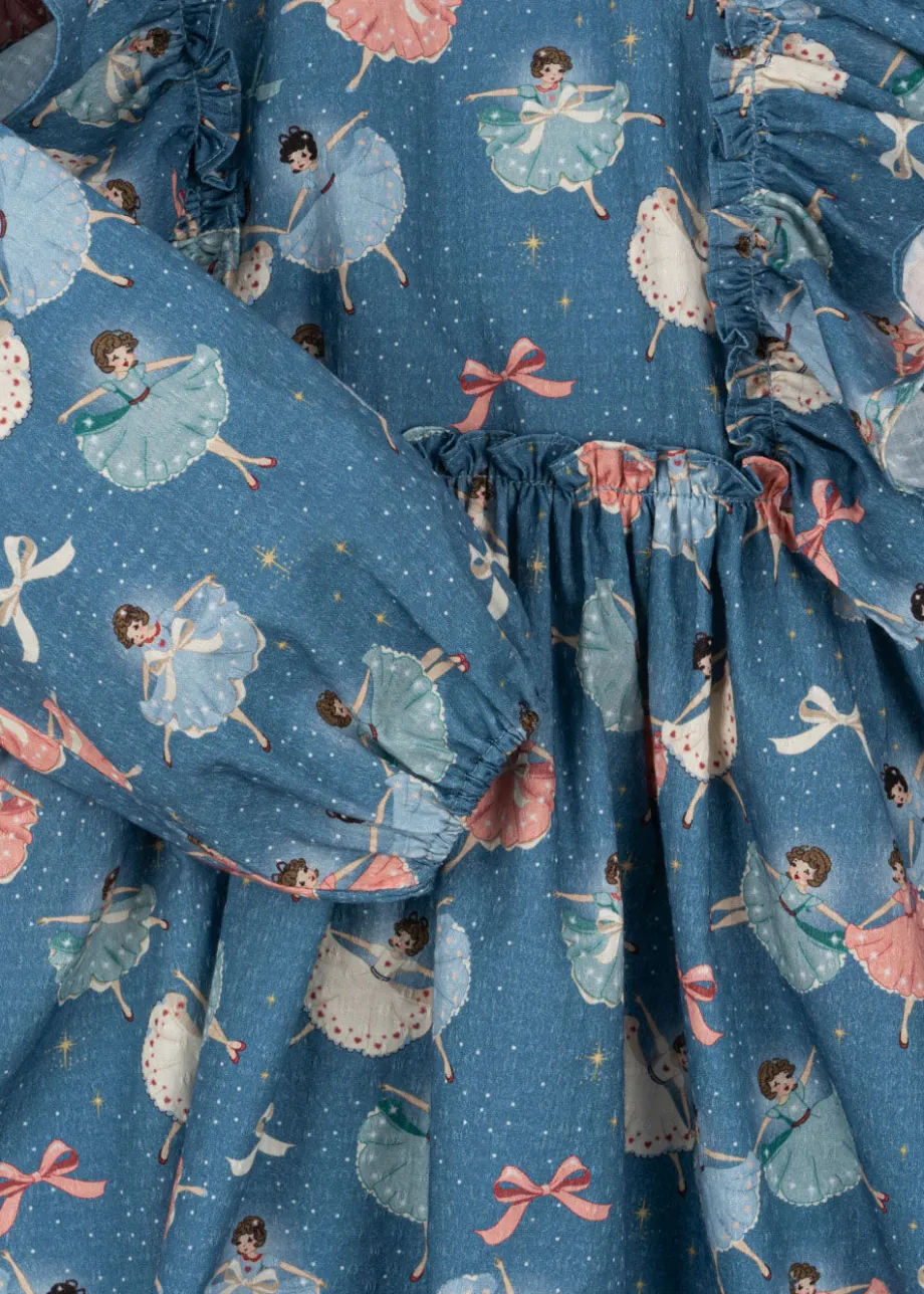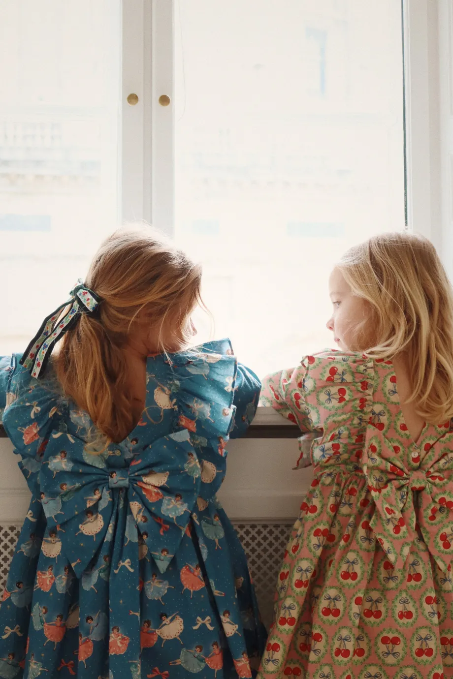 Blød langærmet kjole. Med oversize-sløjfe på ryggen og flæsedetaljer ved ærmerne. Lavet af 100 % økologisk bomuld GOTS. økologisk. certificeret af CU1094701