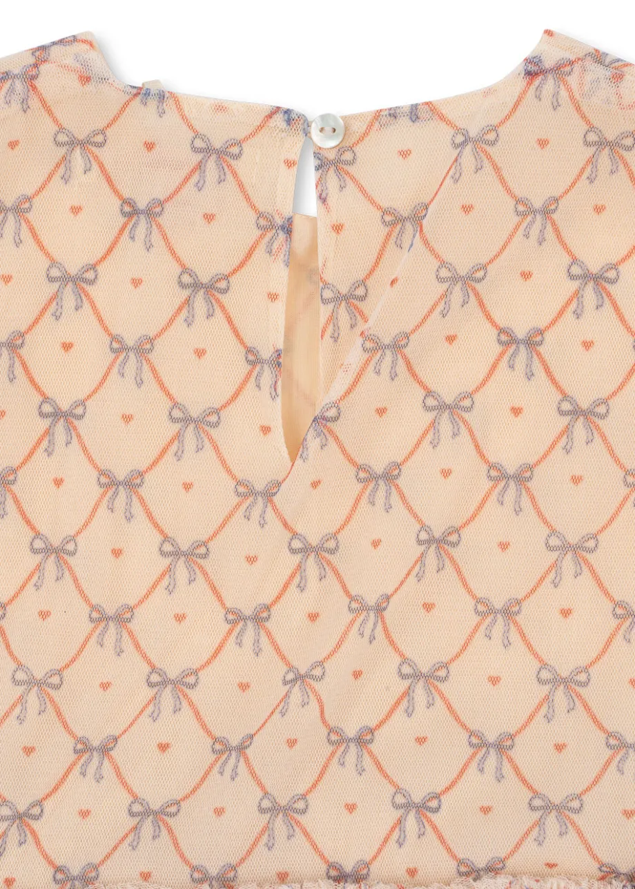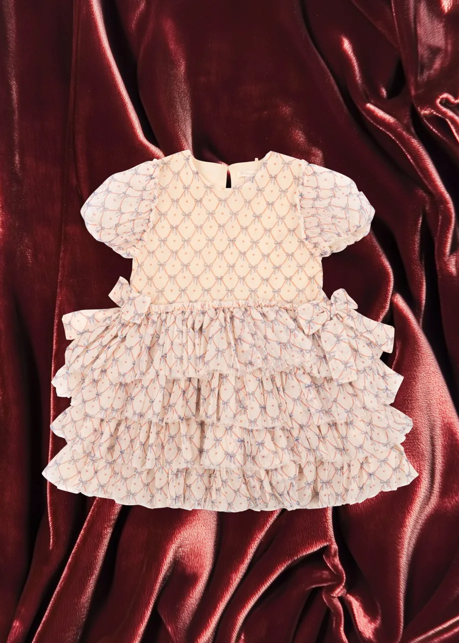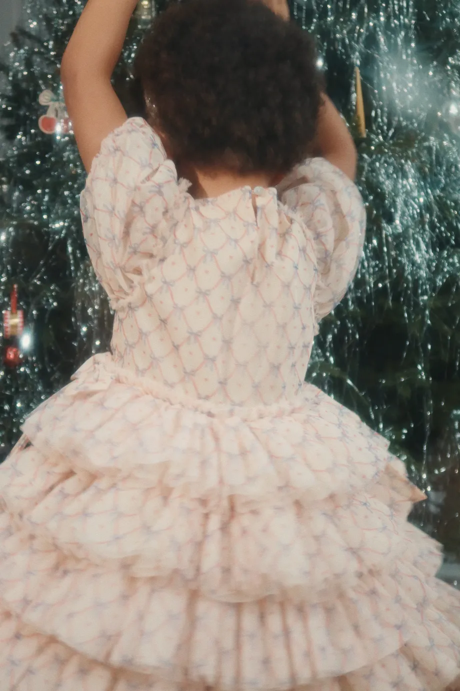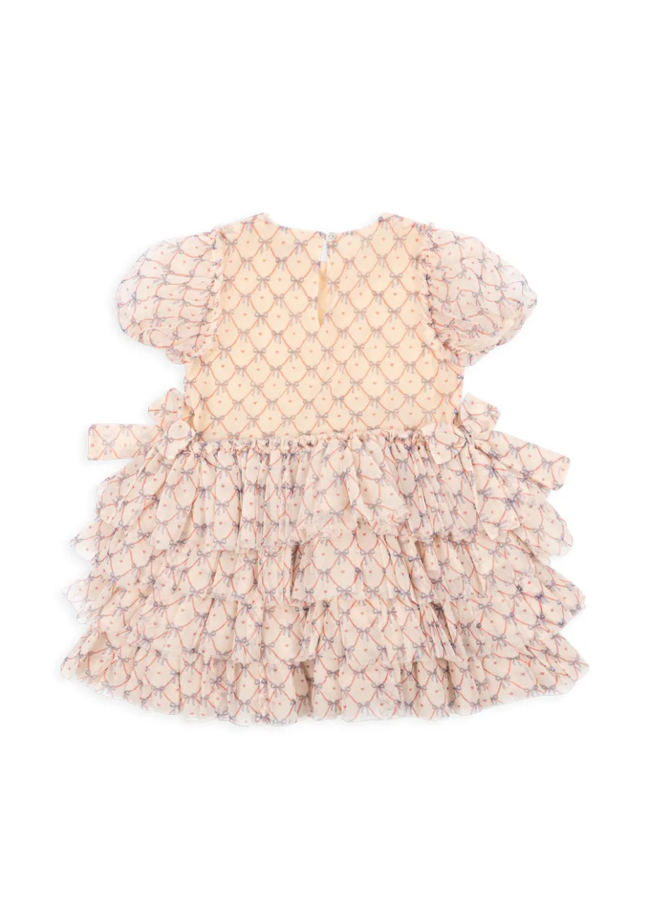 Festlig kjole med elegante og snirklede detaljer. Med pufærmer og et fyldigt. lagdelt skørt. Lavet af 100 % genanvendt polyester med for af 100 % økologisk bomuld Dette produkt i
