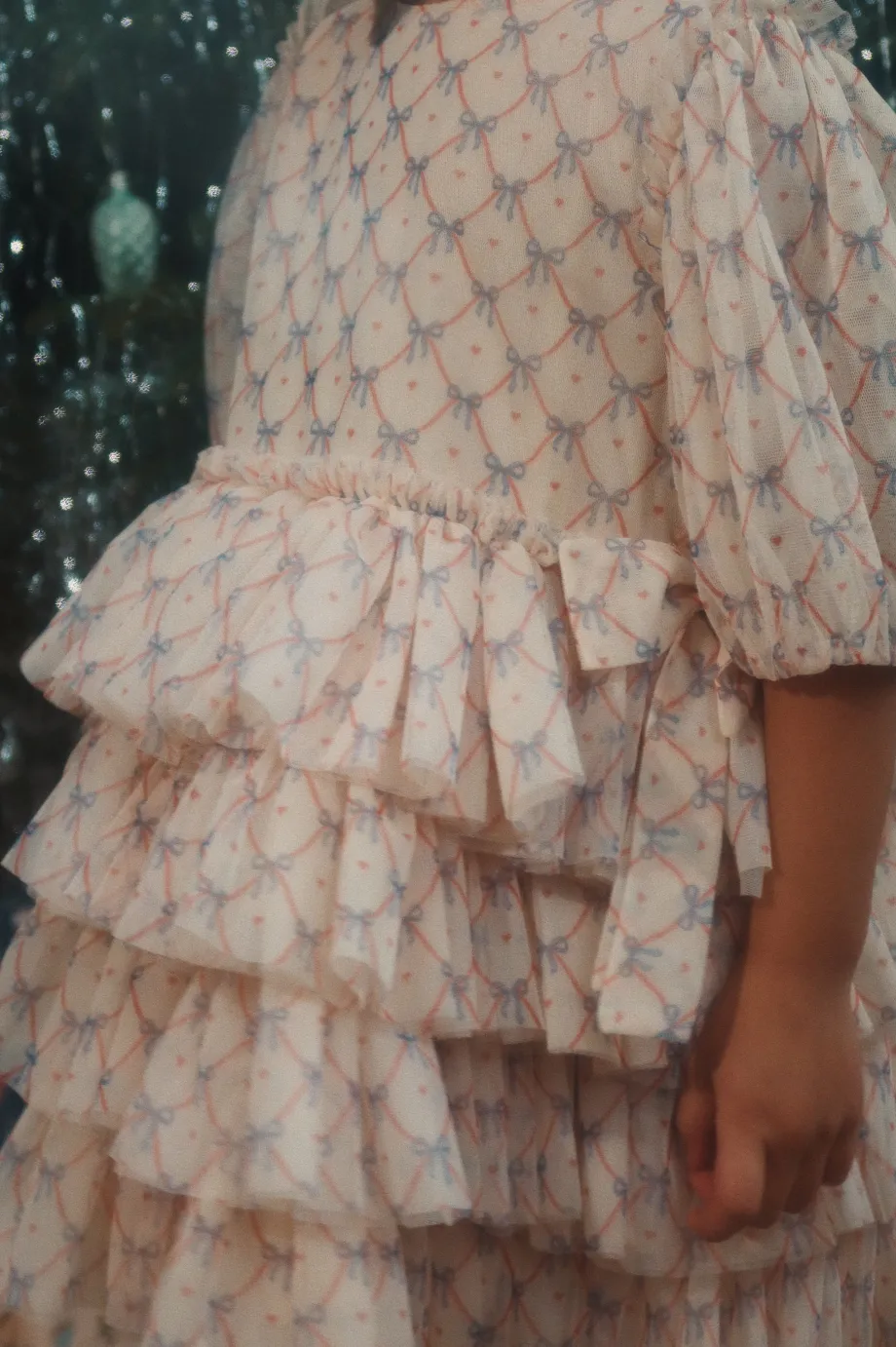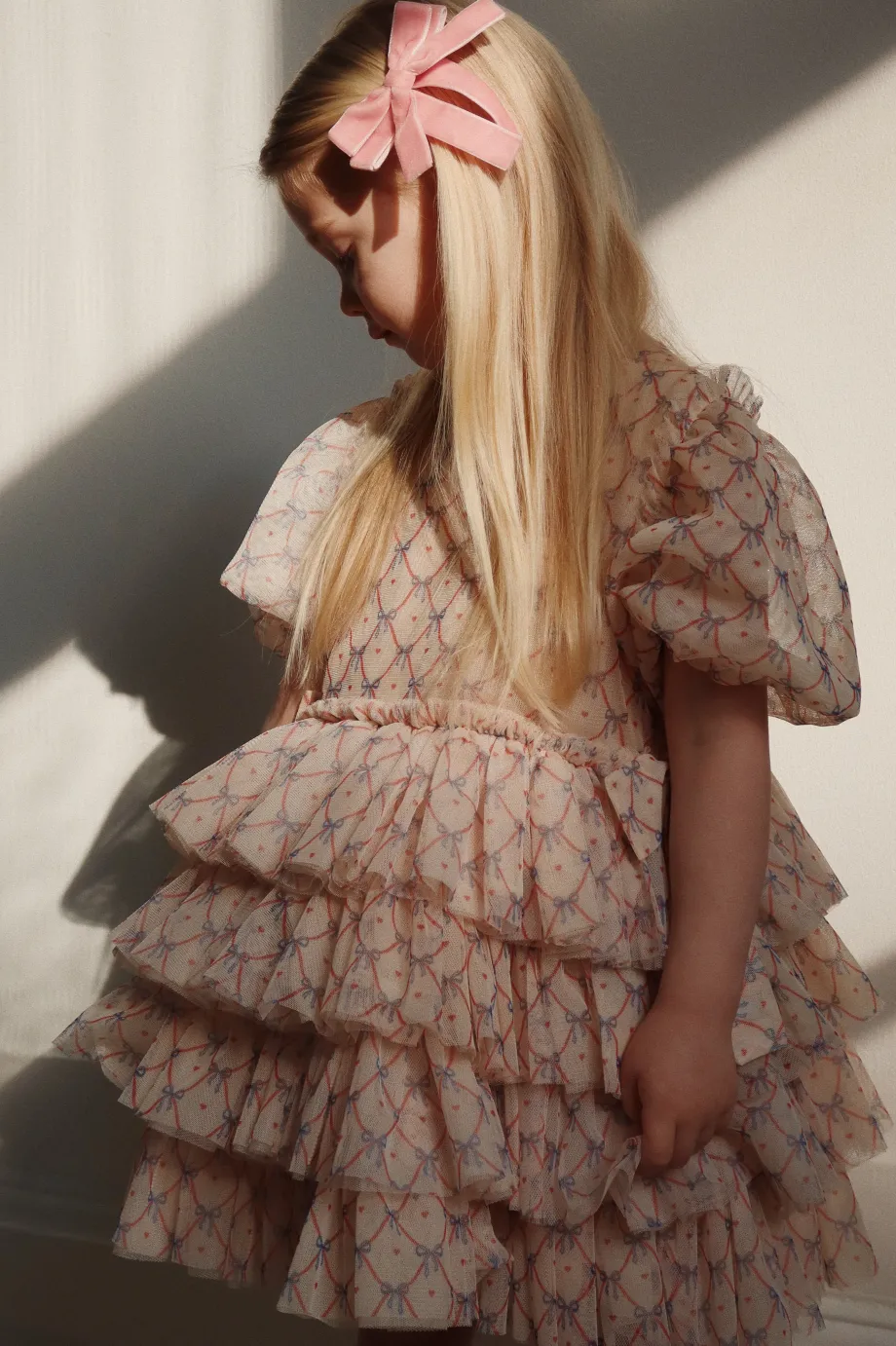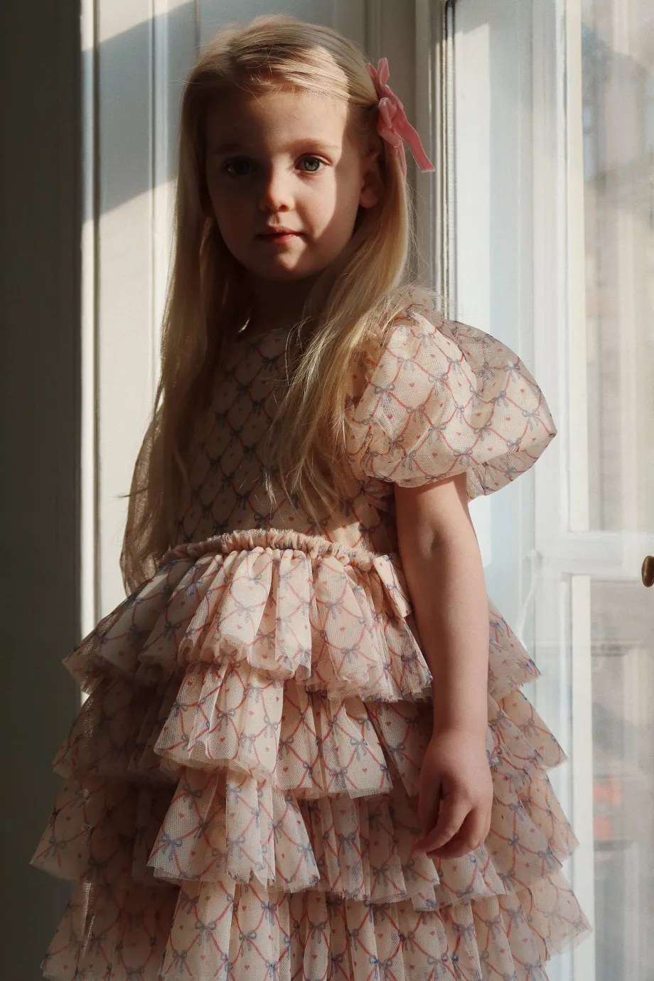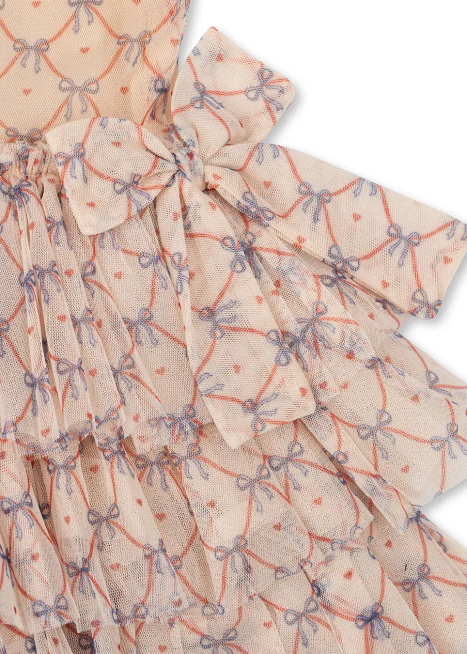 Festlig kjole med elegante og snirklede detaljer. Med pufærmer og et fyldigt. lagdelt skørt. Lavet af 100 % genanvendt polyester med for af 100 % økologisk bomuld Dette produkt i
