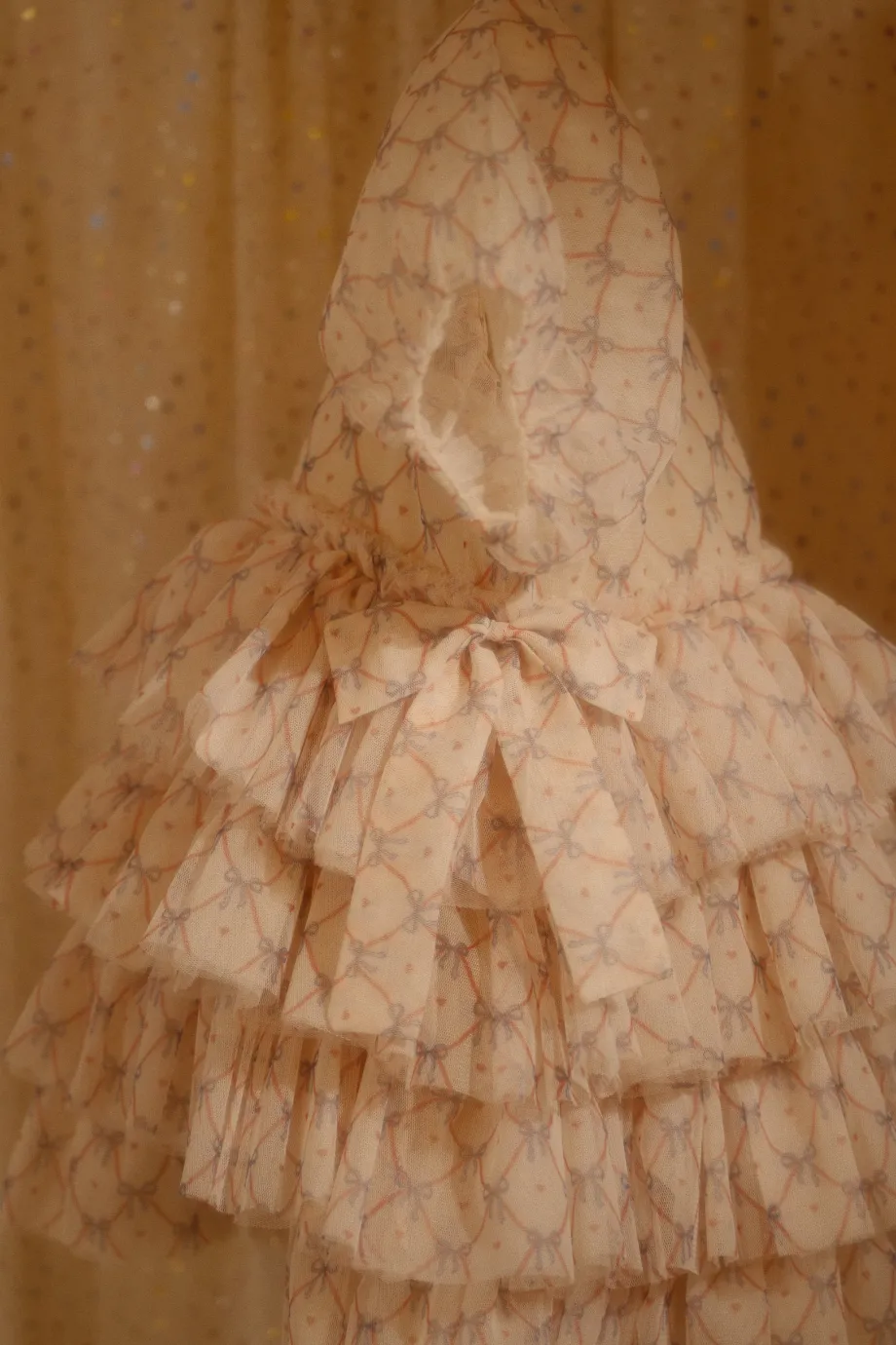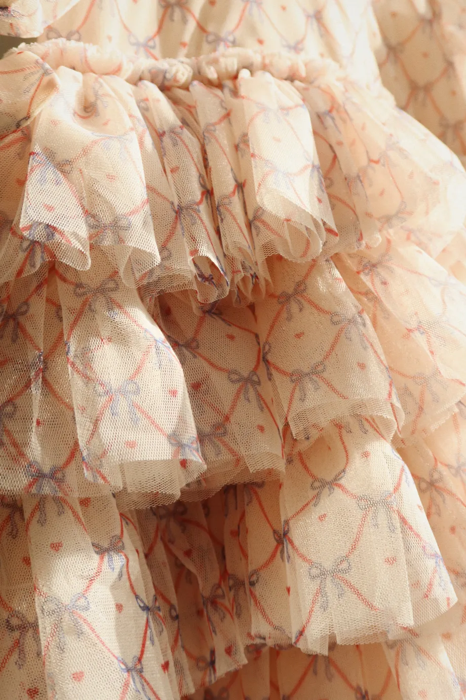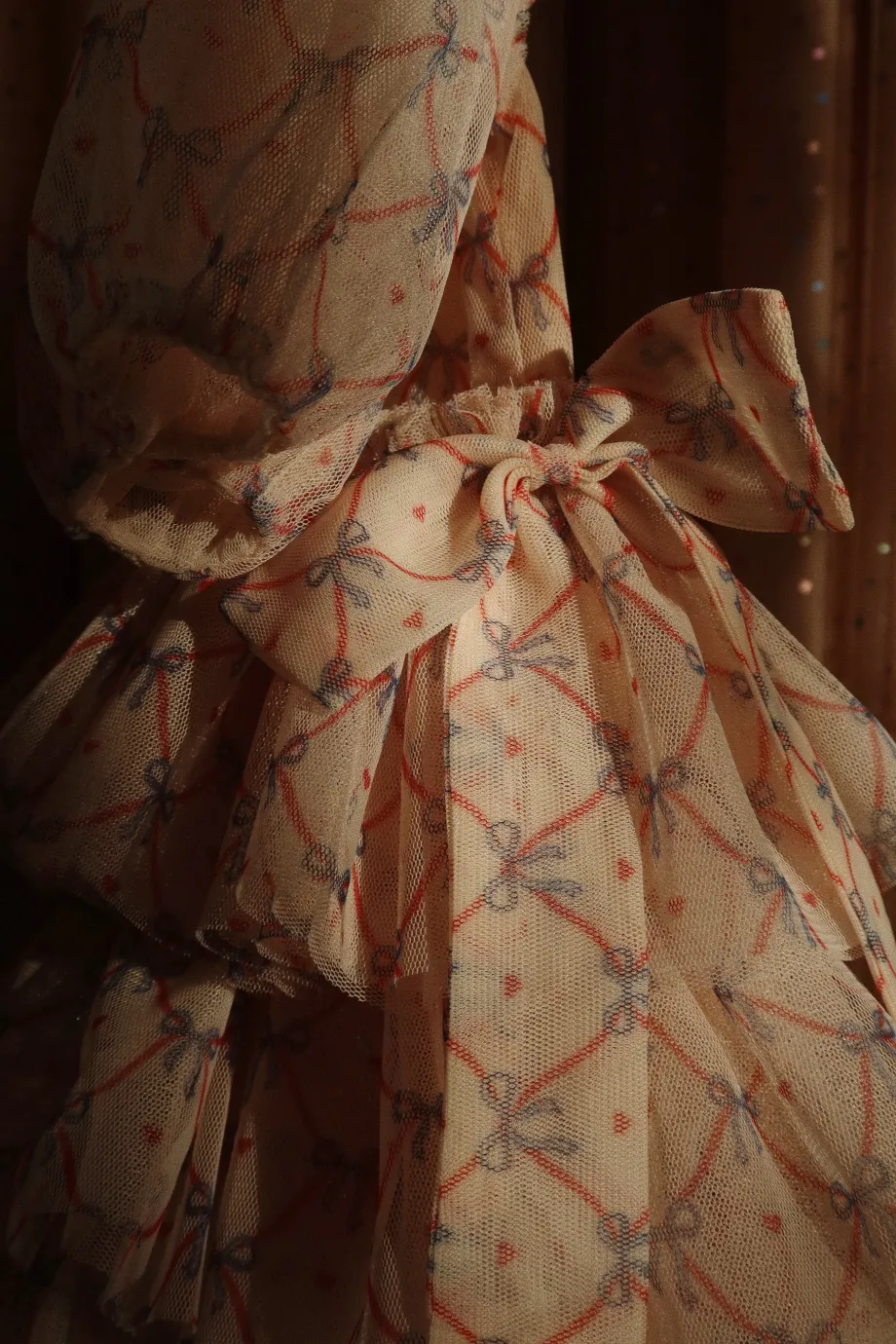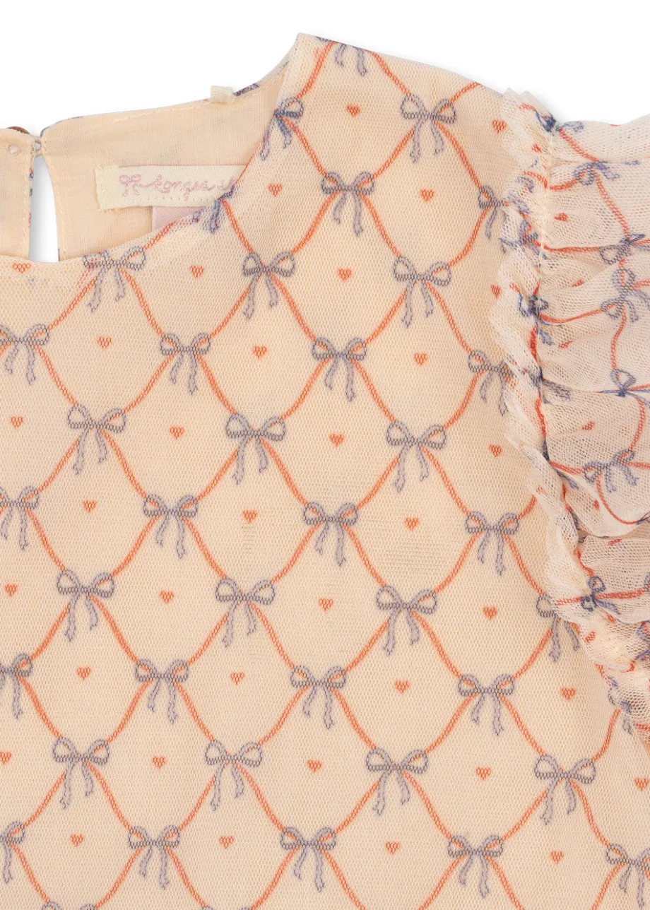 Festlig kjole med elegante og snirklede detaljer. Med pufærmer og et fyldigt. lagdelt skørt. Lavet af 100 % genanvendt polyester med for af 100 % økologisk bomuld Dette produkt i
