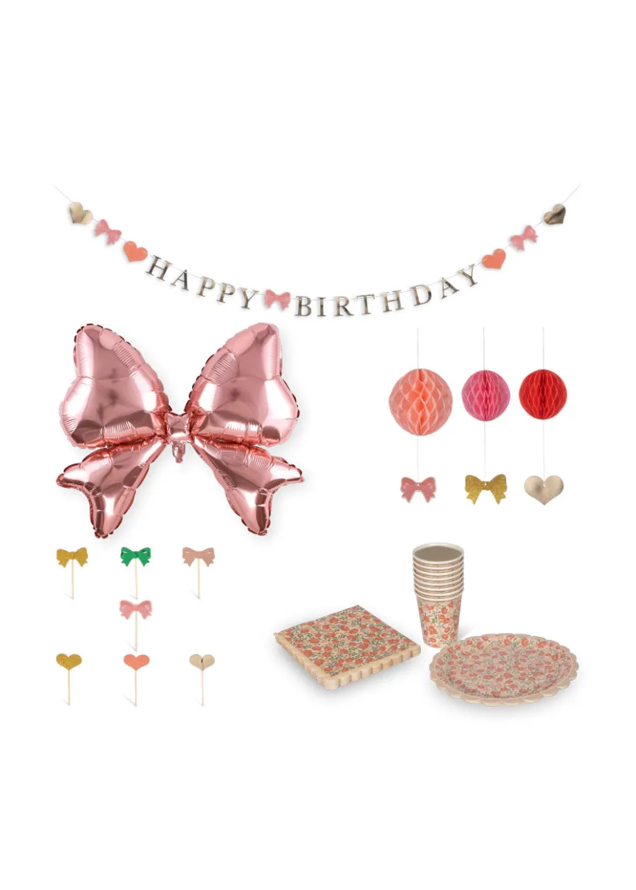 Komplet fødselsdagssæt med alt. hvad du skal bruge for at holde en fest fyldt med sløjfer og hjerter. Sættet indeholder: 8 tallerkener 8 kopper 16 servietter 1 ballon 1 fødselsdag