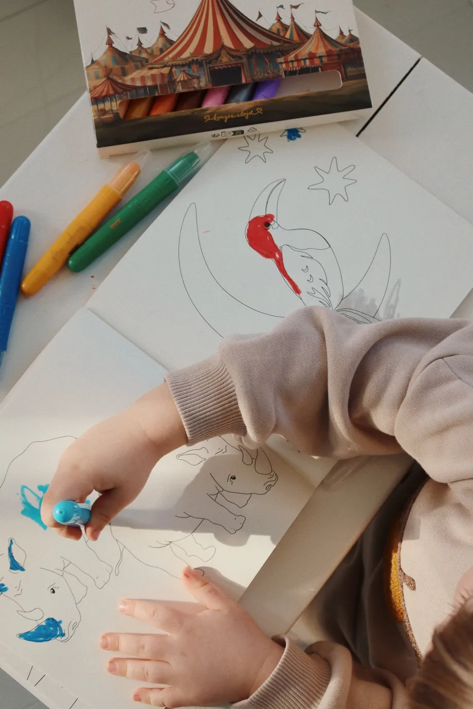 Kreativt kit med 10 gelfarver og en tegneblok med masser af plads til at lade fantasien få frit løb. Fra 3 år ADVARSEL! KVÆLNINGSFARE. Små dele. Ikke egnet til børn under 3 år.
